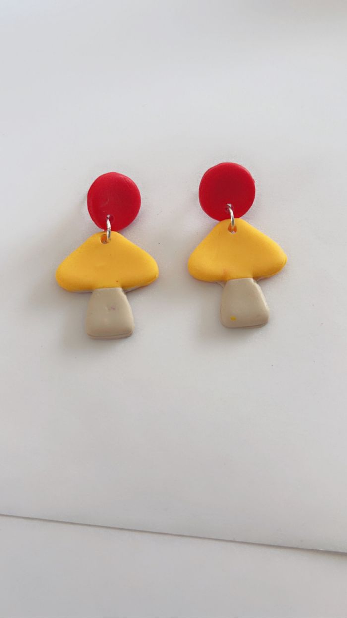 ✨ boucles d’oreilles 🍄‍🟫 forme champignon 🎨 beige, jaune, rouge 🏷️ réalisé en pâte polymère / fimo. Acier inoxydable et fermoir au choix ( acier ou caoutchouc ) Possibilité de passer par Beebs/ kiabi / le bon coin / vint-ed ou envoie la poste avec paiement PayPal #cindythomaasaccessoires #cindythomaasbijoux