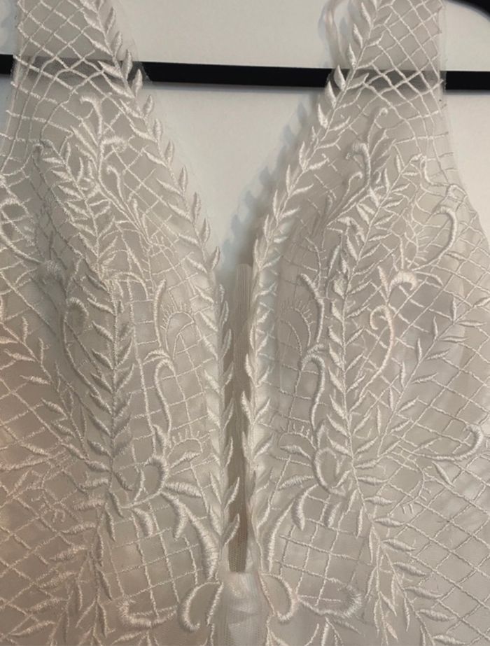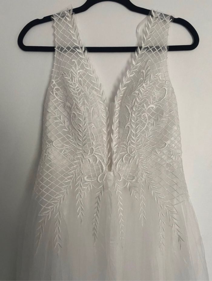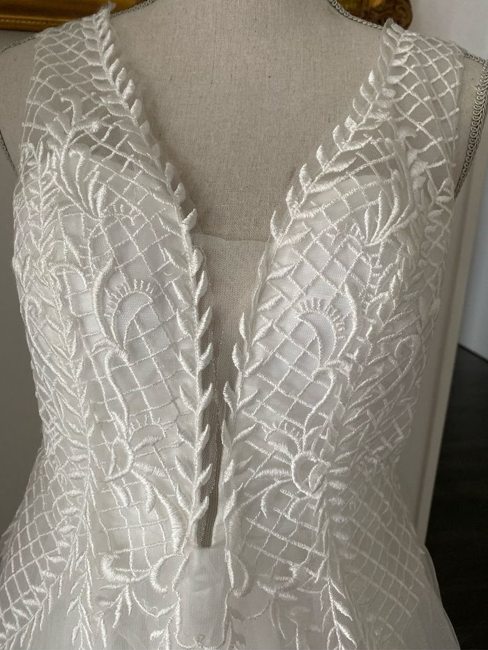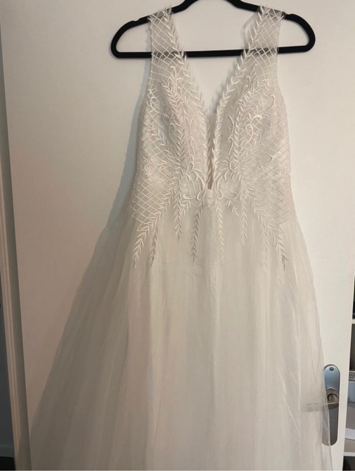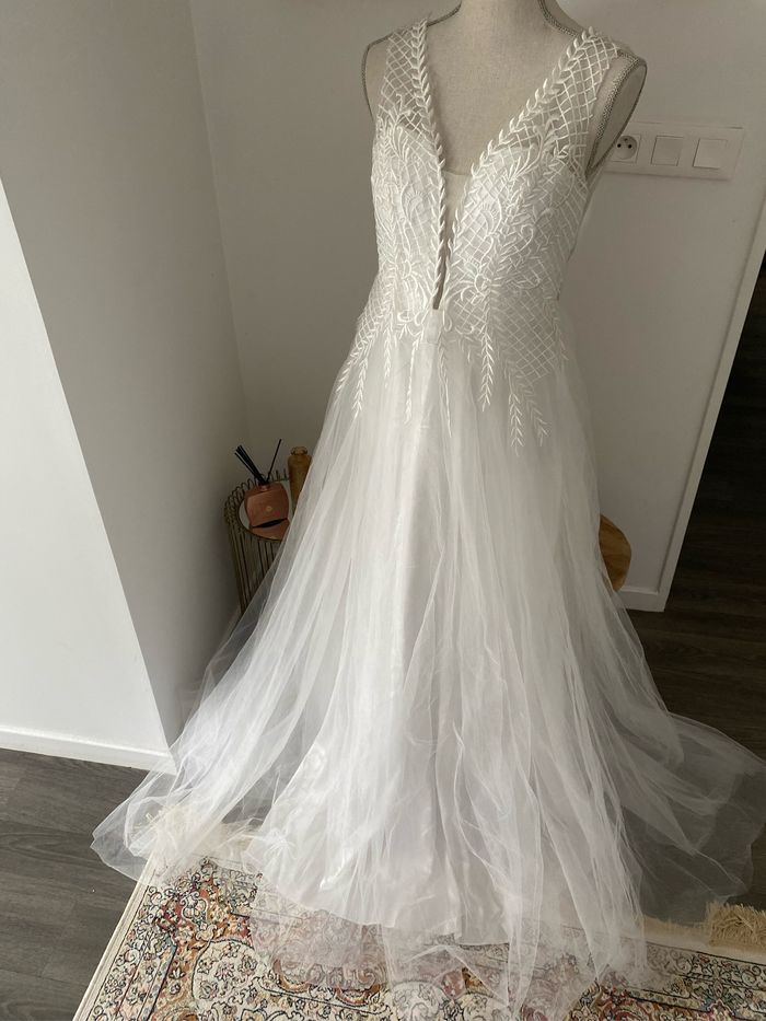 Robe de mariée élégante avec dentelle et jupe fluide Cette superbe robe de mariée combine une élégance moderne avec une touche de romantisme intemporel. • Haut en dentelle : Le buste est orné de délicates broderies en dentelle blanche, formant des motifs floraux et géométriques qui ajoutent de la texture et du raffinement. Le décolleté en V plongeant offre une touche sensuelle tout en restant sophistiquée. • Jupe fluide en tulle : La jupe longue et vaporeuse est faite de plusieurs couches de tulle léger, créant un effet aérien et féérique à chaque mouvement. Elle s’évase à partir de la taille pour une silhouette flatteuse. • Dos subtil : Le dos est orné de fines bretelles en dentelle avec une fermeture éclair invisible pour un ajustement parfait. Le bustier est structuré pour un bon maintien, éliminant le besoin d’un soutien-gorge supplémentaire. Cette robe est idéale pour une mariée à la recherche de légèreté et de simplicité sans compromettre le style et l’élégance. Elle a été soigneusement conservée et est en excellent état, prête à être portée pour un jour mémorable.