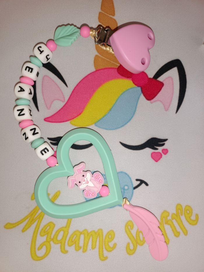Une Suspension d'éveil Lapin pour que bébé s'occupe tout en s'amusant et même soulager ses poussées dentaires en le mâchouillant. Composée d'un clip pour accrocher au tissu sans l'abîmer, à l'extrémité, une perle entourée d'un anneau pour développer les sens de bébé. Respect des normes CE, composée de perles silicone alimentaire et/ou bois naturel. 100% personnalisable, énormément de choix de clips, perles, etc… Envoyez-moi un message afin de créer main dans la main votre accessoire idéal. Une photo du prototype de celui-ci vous est envoyé pour validation avant envoi.