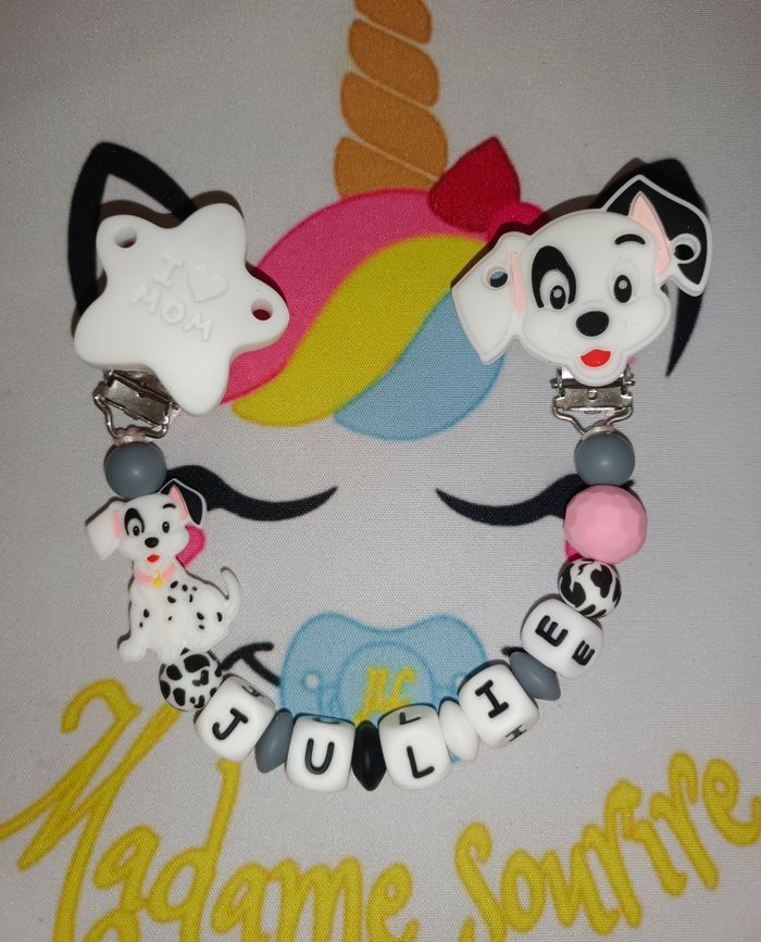 Une Attache doudou Dalmatien pour ne plus perdre le doudou avec deux clips pour accrocher aux tissus sans les abîmer, un pour le vêtement, l'autre au doudou. Respect des normes CE, composée de perles silicone alimentaire et/ou bois naturel. 100% personnalisable, énormément de choix de clips, perles, etc… Envoyez-moi un message afin de créer main dans la main votre accessoire idéal. Une photo du prototype de celui-ci vous est envoyé pour validation avant envoi.