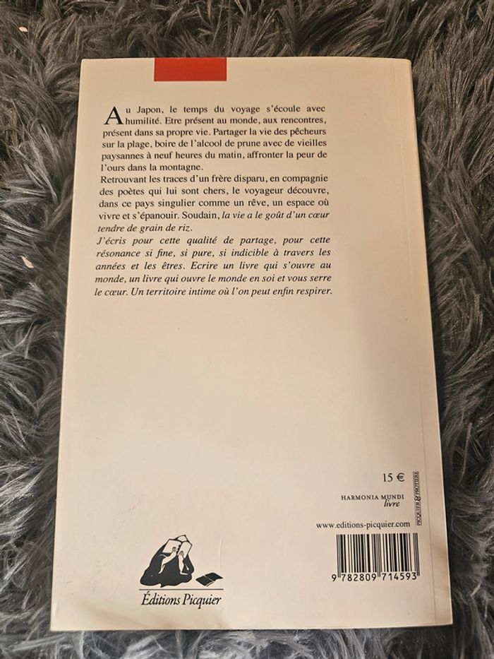 Au Japon, le temps du voyage s'écoule avec humilité. Etre présent au monde, aux rencontres, présent dans sa propre vie. Partager la vie des pêcheurs sur la plage, boire de l'alcool de prune avec de vieilles paysannes à neuf heures du matin, affronter la peur de l'ours dans la montagne. Retrouvant les traces d'un frère disparu, en compagnie des poètes qui lui sont chers, le voyageur découvre, dans ce pays singulier comme un rêve, un espace où vivre et s'épanouir. Soudain, la vie a le goût d'un coeur tendre de grain de riz. J'écris pour cette qualité de partage, pour cette résonance si fine, si pure, si indicible à travers les années et les êtres. Ecrire un livre qui s'ouvre au monde, un livre qui ouvre le monde en soi et vous serre le coeur. Un territoire intime où l'on peut enfin respirer. Edition : P. Picquier Dimension : 13 X 21 X 1.4 Auteur : Alexandre Bergamini Nombre de pages : 154 STRICTEMENT NEUF #roman #litterature