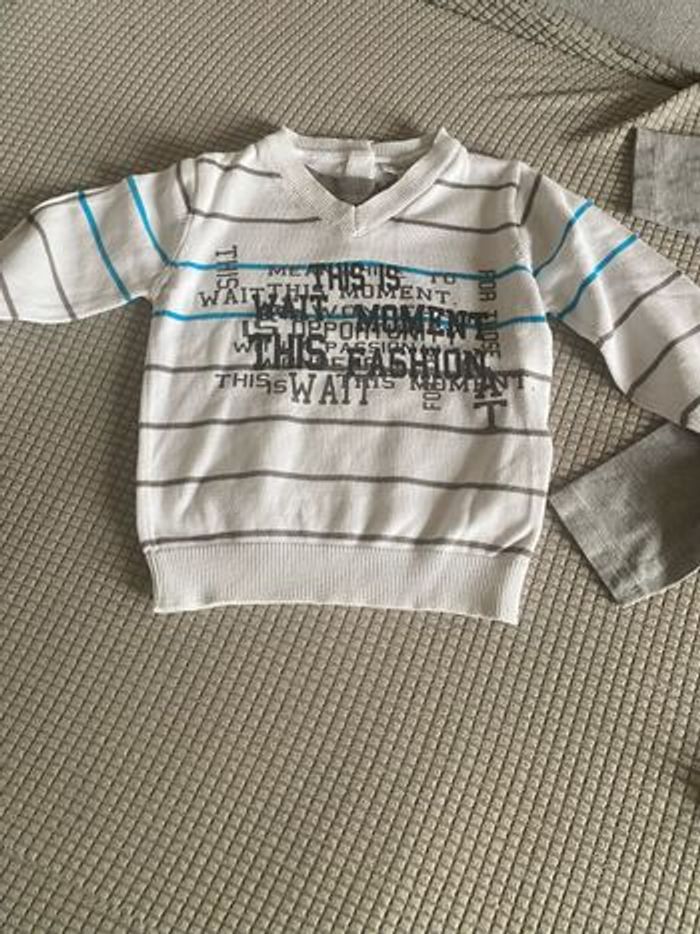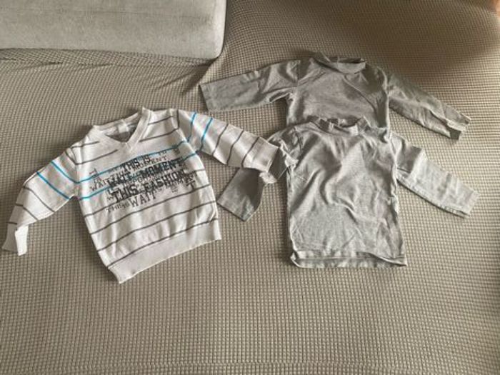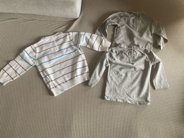 Un pull très bon état + 2 polos neufs 18 mois J’ai d’autres vêtements 18 mois : ensemble polo , pantalons , des gilets , pyjamas etc Pensez à faire un lot