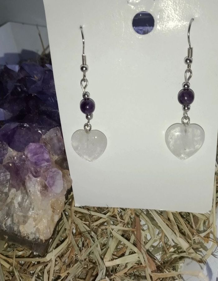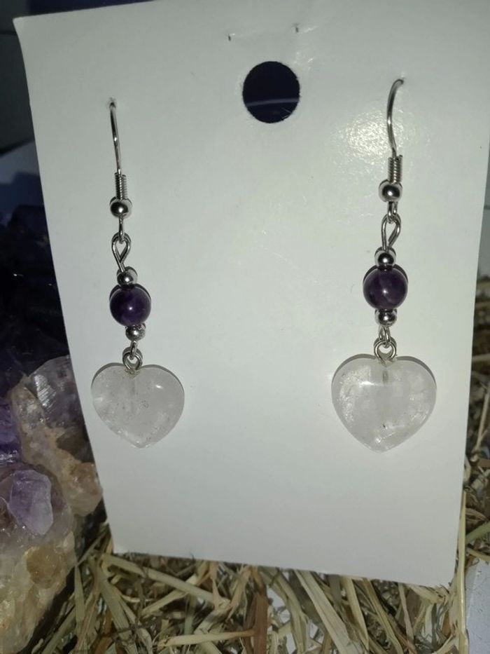 Boucles d'oreilles lithotherapie perles d'améthyste et coeur de quartz laiteux Pièce unique car fait main Pour plus d'informations demandé