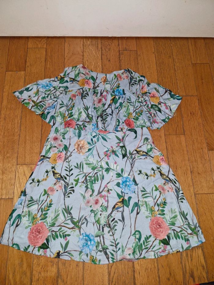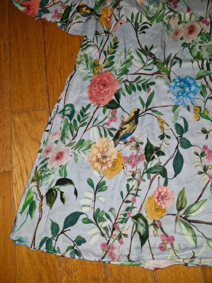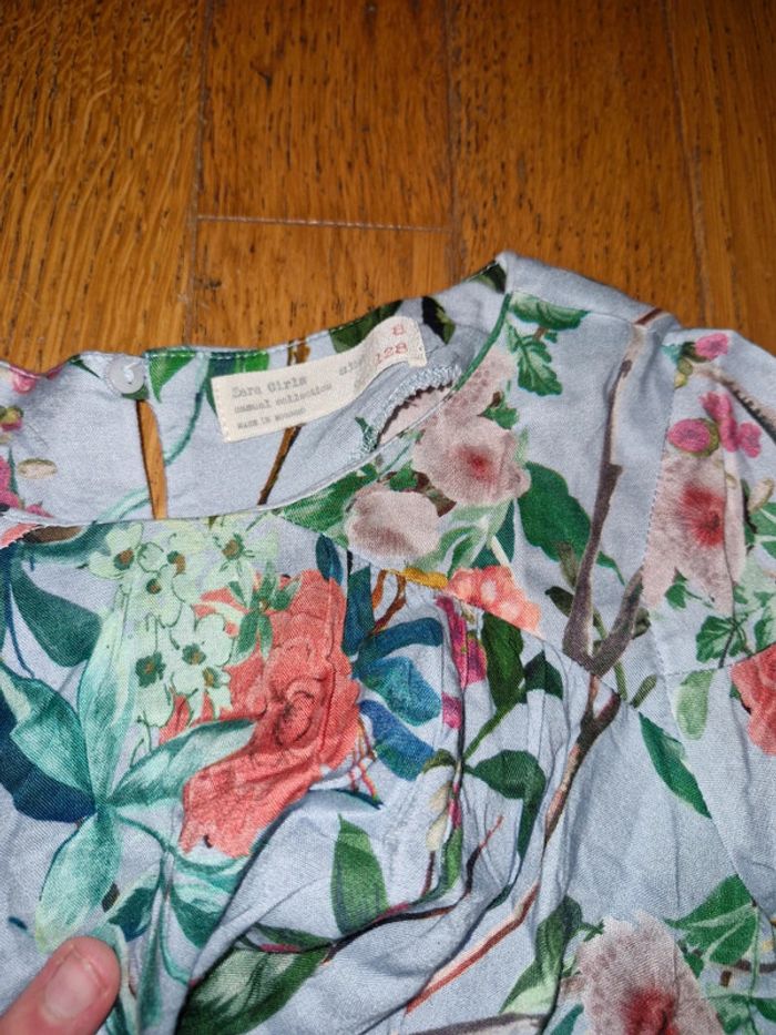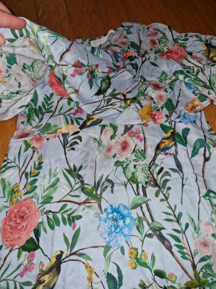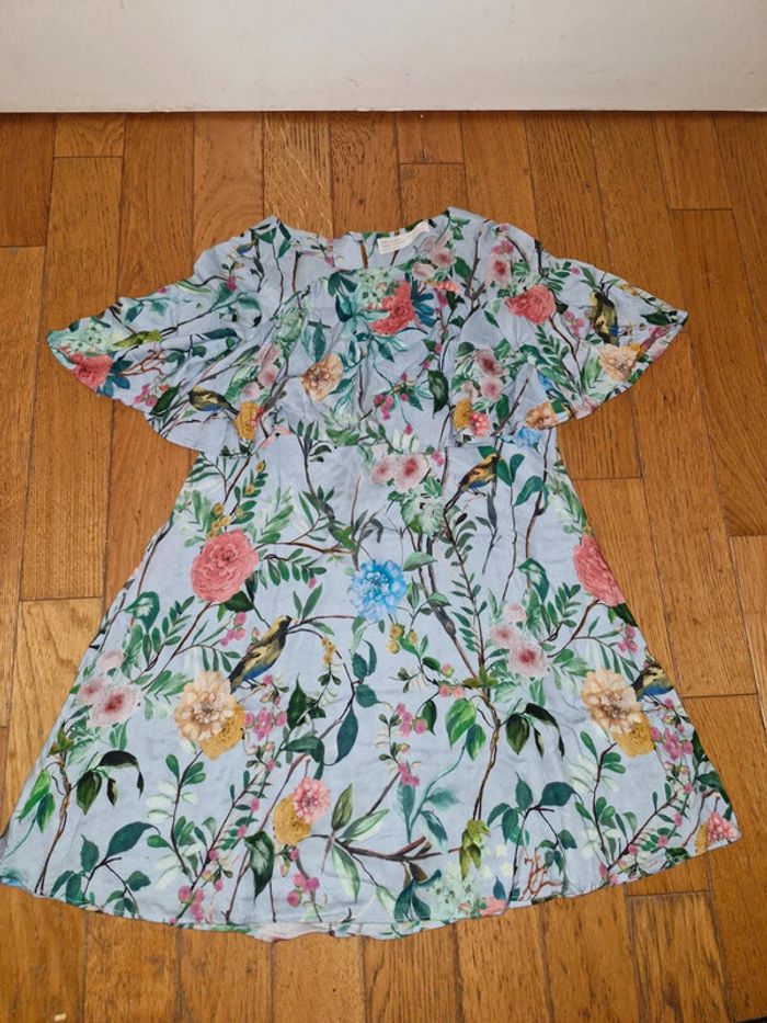 Robe venant de chez zara Taille 8 ans 128 cm Imprimée avec fleurs et oiseau Effet volant en haut Se ferme par un bouton à l arriere Doublée sur la partie inférieure Parfait état Manque étiquette composition et entretien