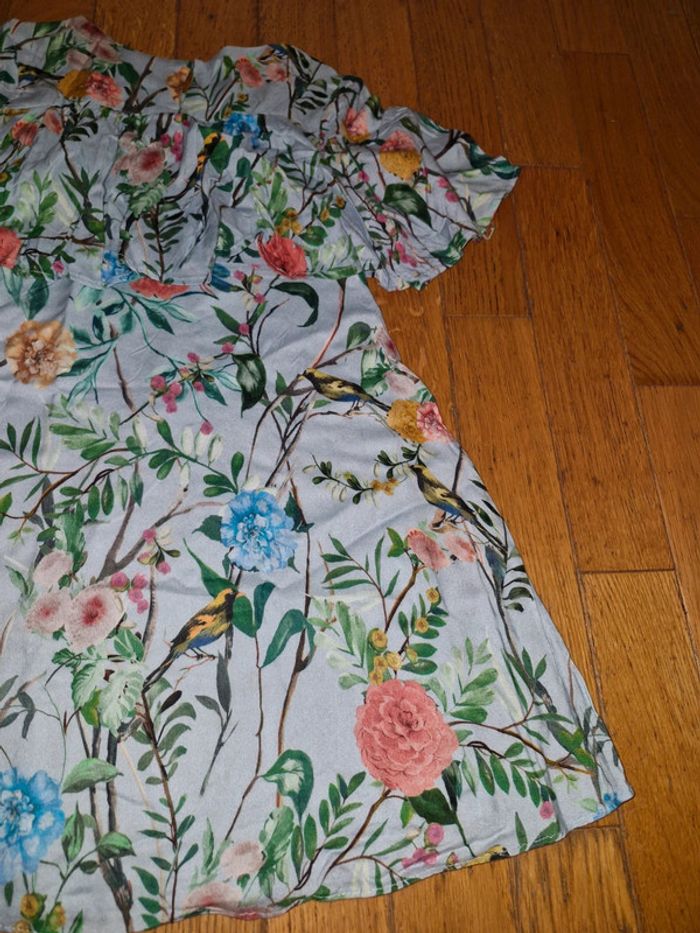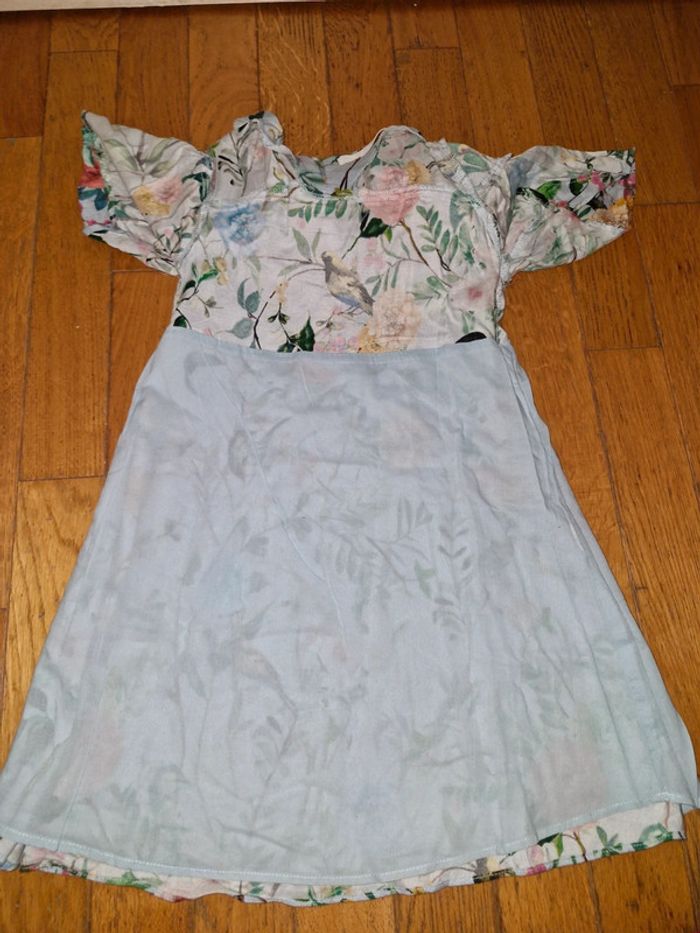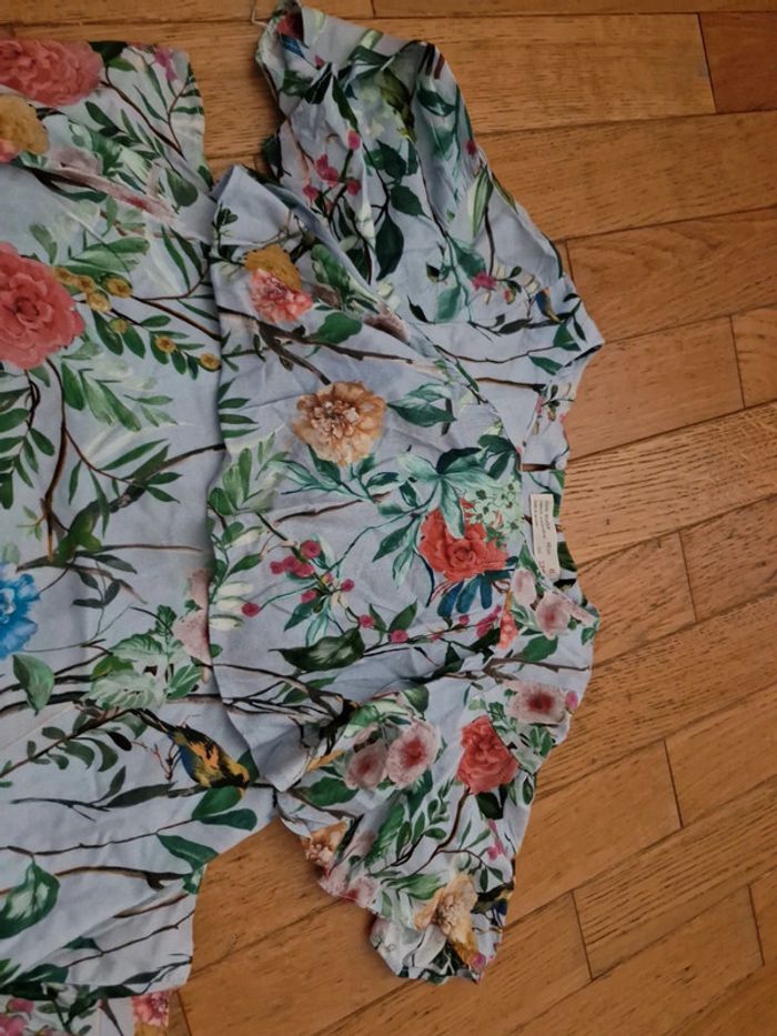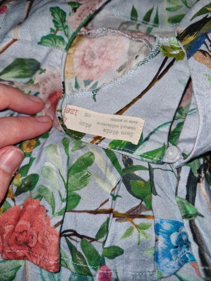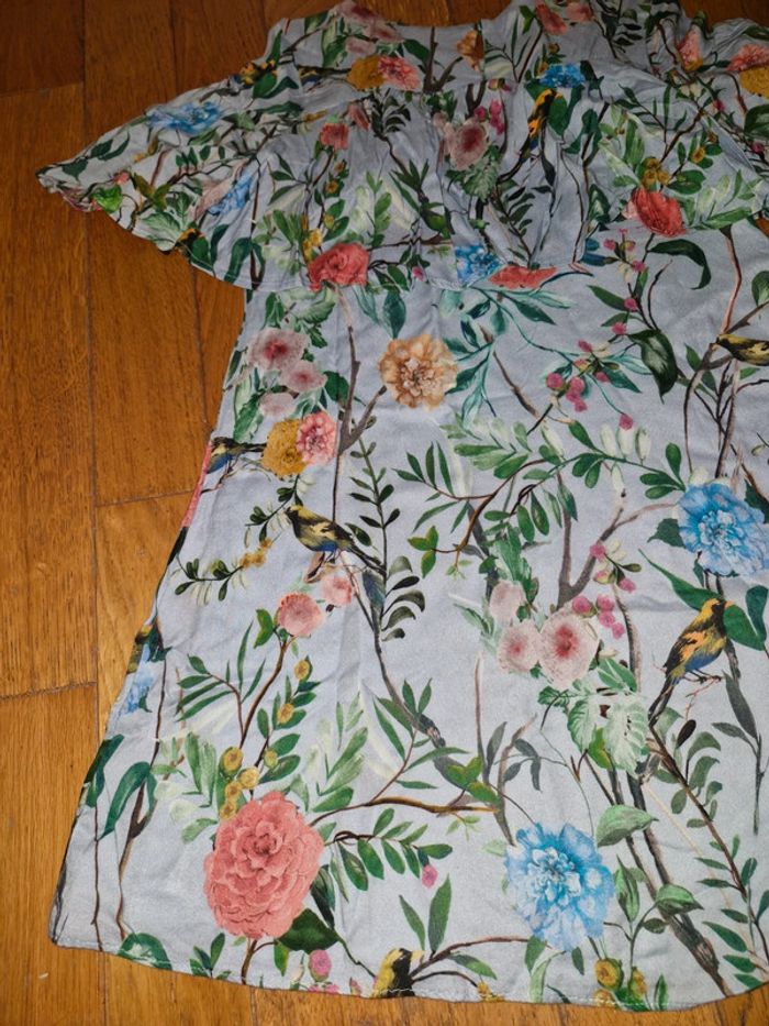 Robe venant de chez zara Taille 8 ans 128 cm Imprimée avec fleurs et oiseau Effet volant en haut Se ferme par un bouton à l arriere Doublée sur la partie inférieure Parfait état Manque étiquette composition et entretien