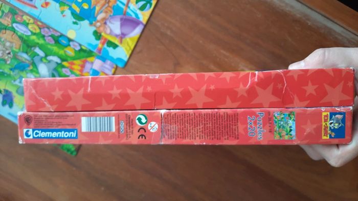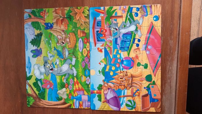 Boite contenant deux puzzles de 20 pièces chacun Ayant pour thème Tom et Jerry Un puzzle à une pièce abimé cf photo Carton Network clementoni Sur chaque puzzle il est indiqué warner bros. Sur la boite presence de stoch et d usure