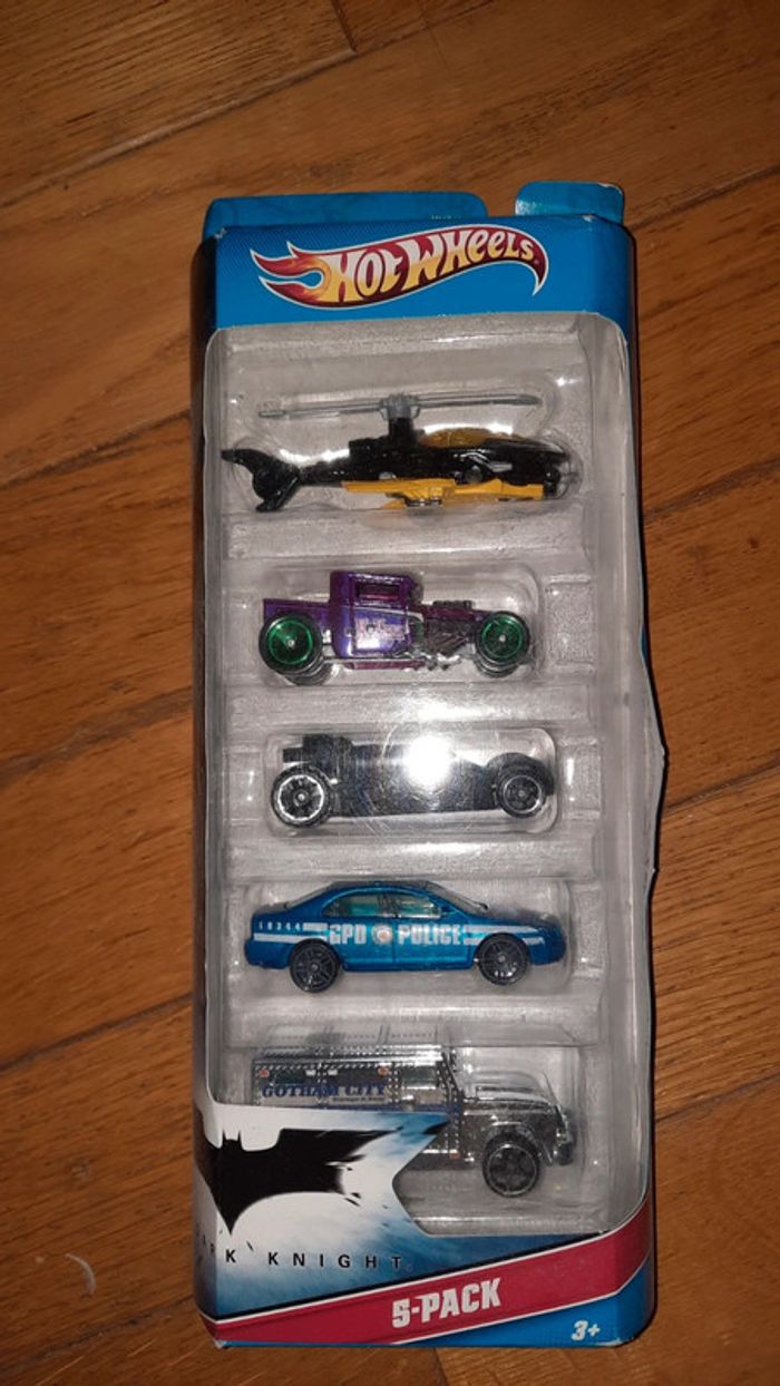 Coffret hot wheels W4240 Comprenant 5 véhicules de Batman the Dark knight Boite non ouverte mais abimée: sur un des côtés devant, en haut et l arriere #ValandreHotWheels