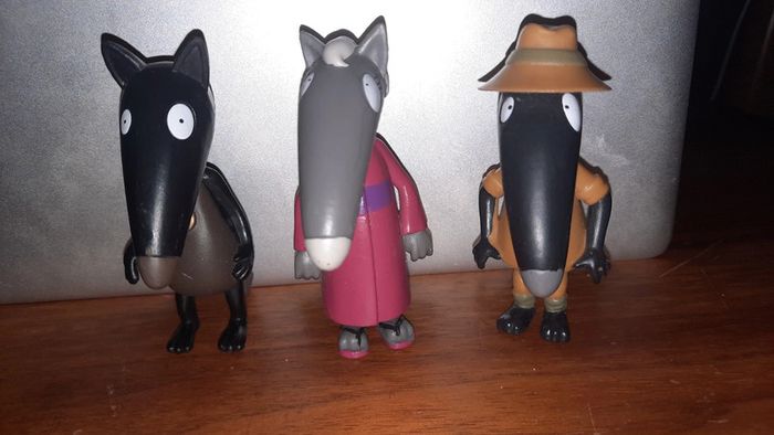 Lot de 3 fgurines issu de la célèbre série de livres des éditions Auzou Le loup Loup Avec une médaille Loup reporter avec veste chapeau et appareil photo Louve Presence de traces d usures #ValandreJouet