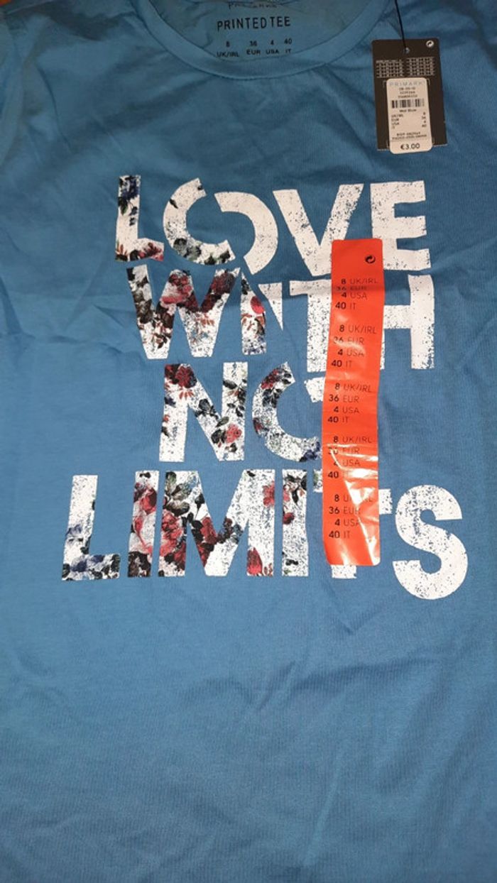 Tee shirt mc neuf avec dessin devant Couleur bleu Marque primark Taille 36 Neuf avec étiquette