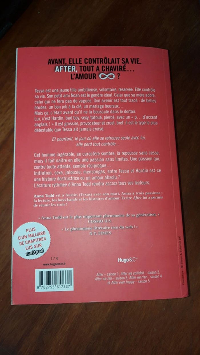 Livre broché Edition Hugo Romance Anna Todd After saison 1 État couverture un peu abimée avec coins du bas un peu abimé, quelques pages un peu corné presence de noir sur la cote page en bas #ValandreLivreAdulte