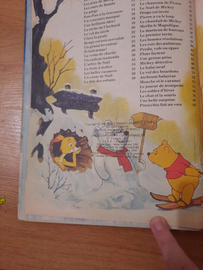 Livre Walt Disney encyclopédie et connaissances une histoire par jour hiver livre de 1980 état satisfaisant malgré son âge abîmé sur la côte en haut en haut coin abîmé et présence d'écriture sur la page de garde devant cf photos