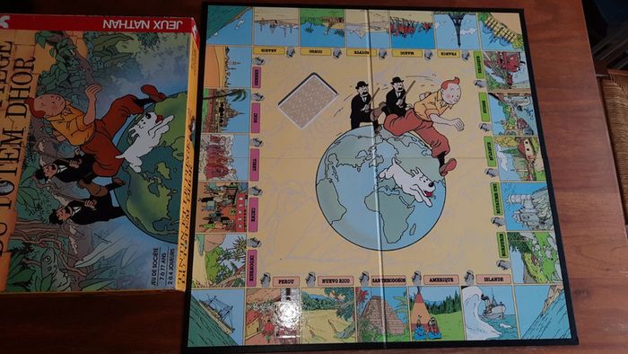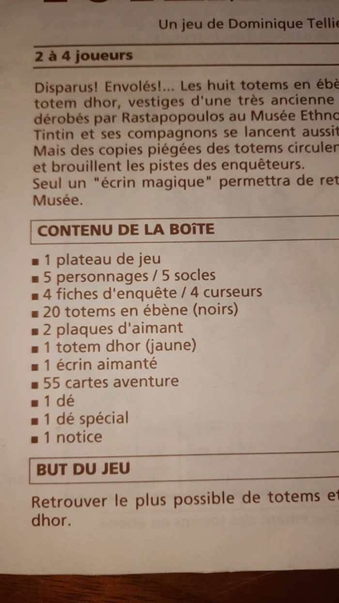 Jeu vintage Nathan Tintin et le piège du totem Dhor Complet un coin de la boite est abimé La notice indique dans la partie contenue 2 plaques d aimant mais comme indiqué dans la partie préparation de la partie les aimants sont désormais collé sur les totems #ValandreJeu