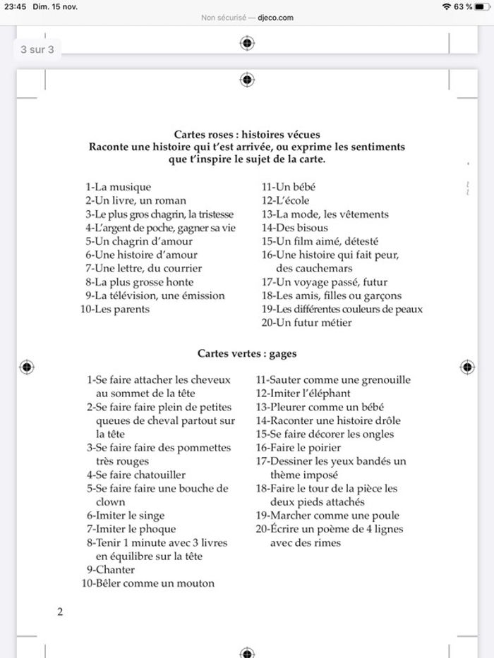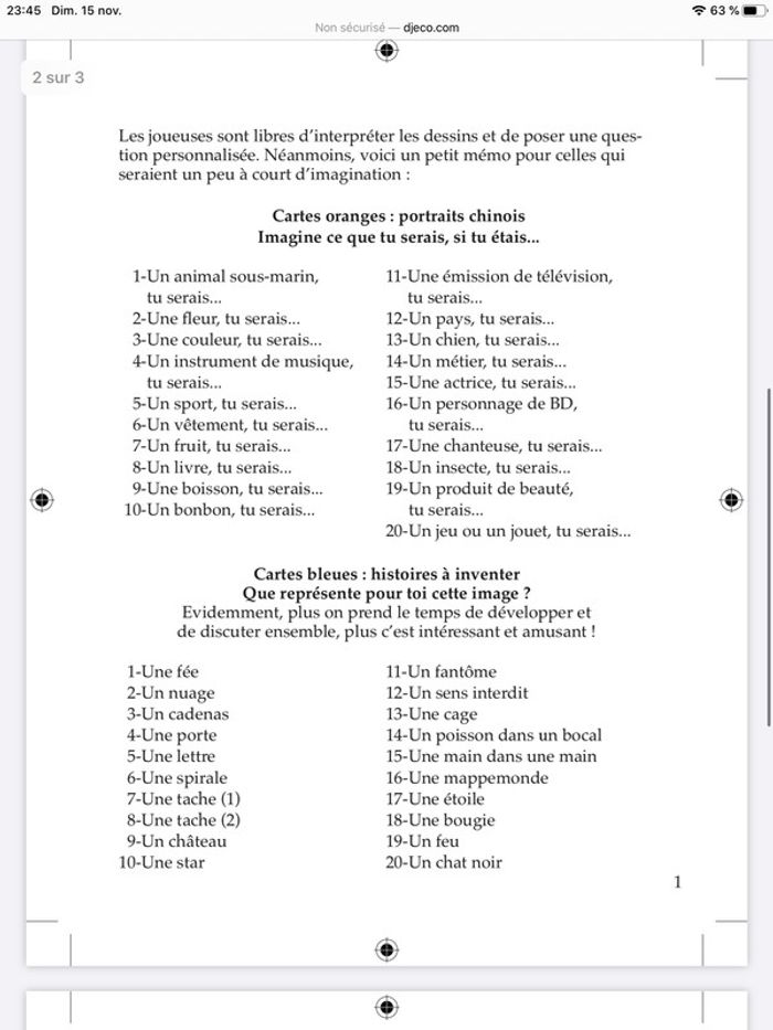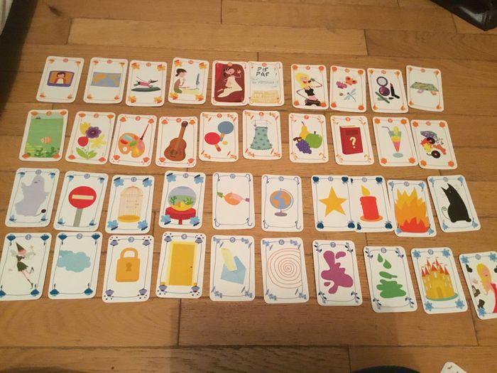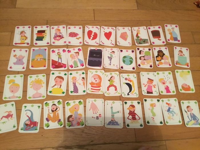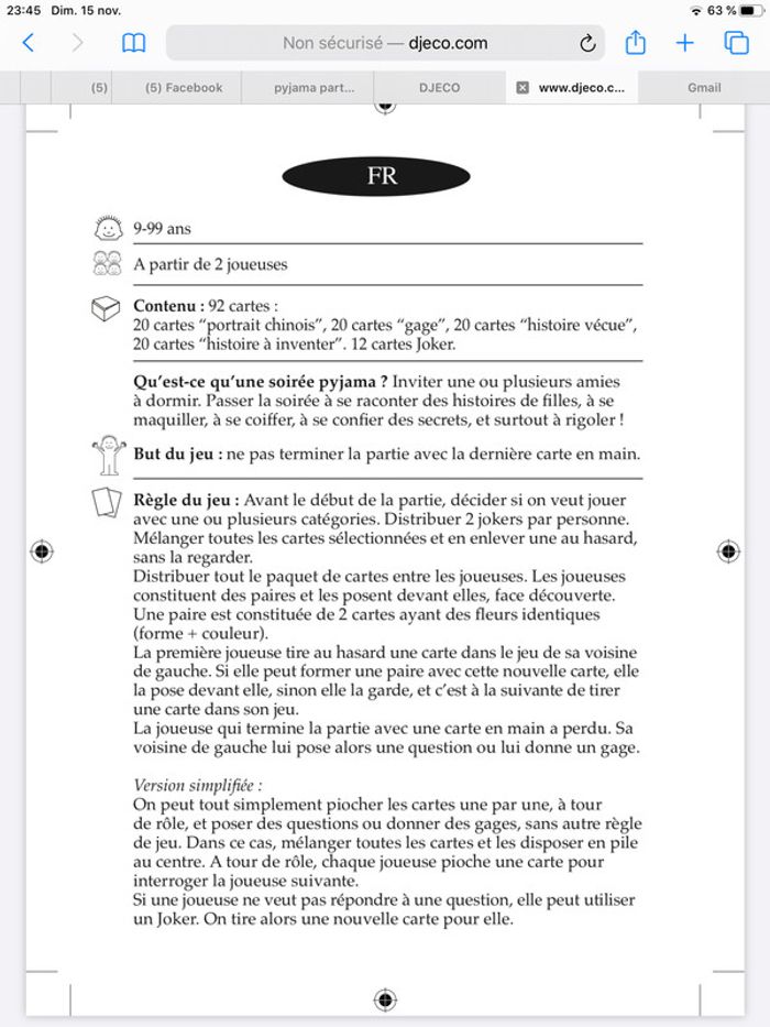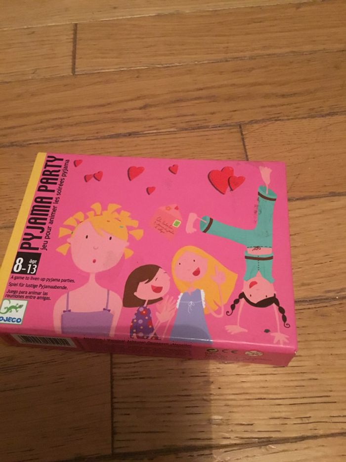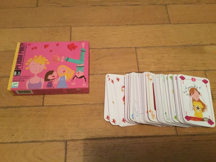 Jeu de cartes Djeco 8/13 ans pour animer une pyjama party les 92 cartes sont présentes Pas de notice mais trouvable sur le site de la marque j ai fait une capture afin que vous puissiez la lire.