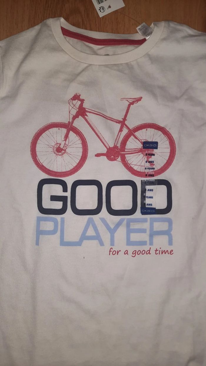 Tee shirt blanc okaidi taille 8 ans Avec dessin de vélo devant Encore étiqueté mais CEPENDANT PRESENCE DE TACHES DANS LE DOS par conséquent état satisfaisant d indiqué #Valandre8Ans