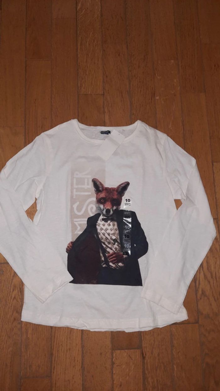 Tee shirt blanc ml avec dessin de renard Encore étiqueté Marque kiabi Effet découpé en bas d origine Taille 10 ans #Valandre10ans
