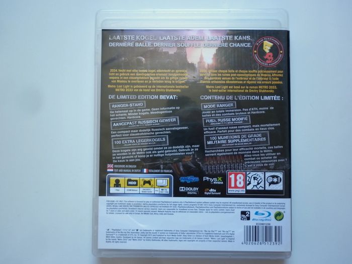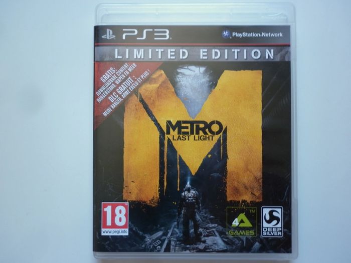 Metro Last Light édition limitée Jeu Vidéo "PS3" Playstation 3 (en très bon état). Inclus le boitier d'origine. Le livret n'est plus présent. Jeu en Français, Anglais, Néerlandais. Allez voir mes autres objets!!