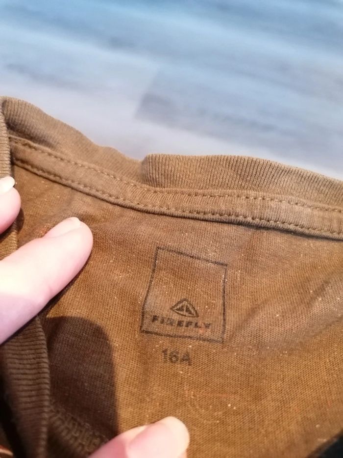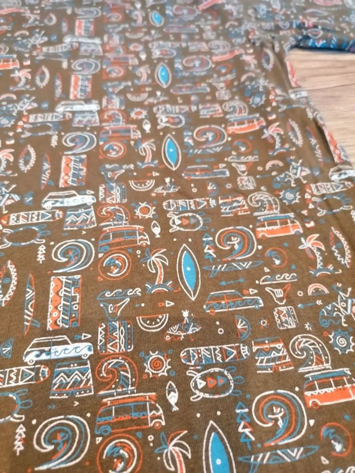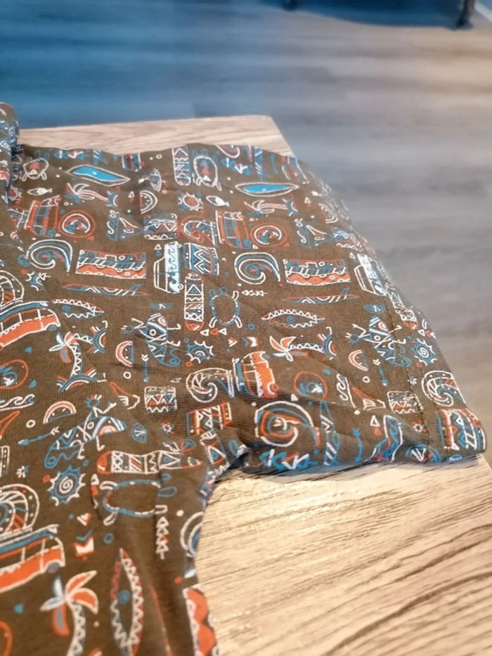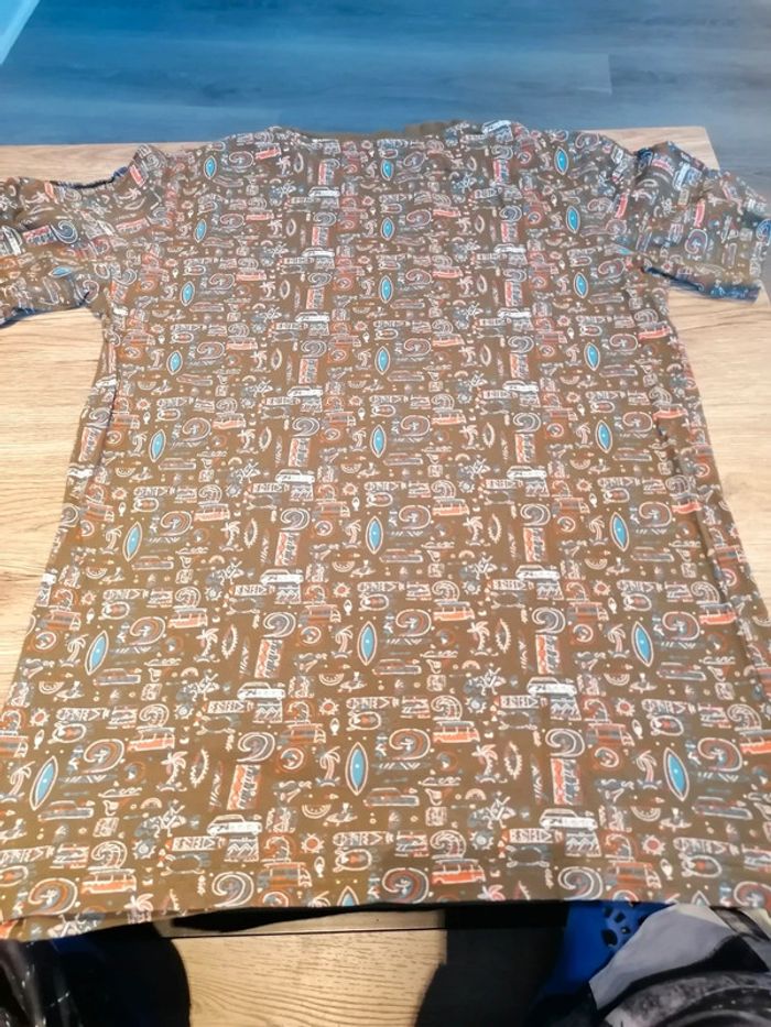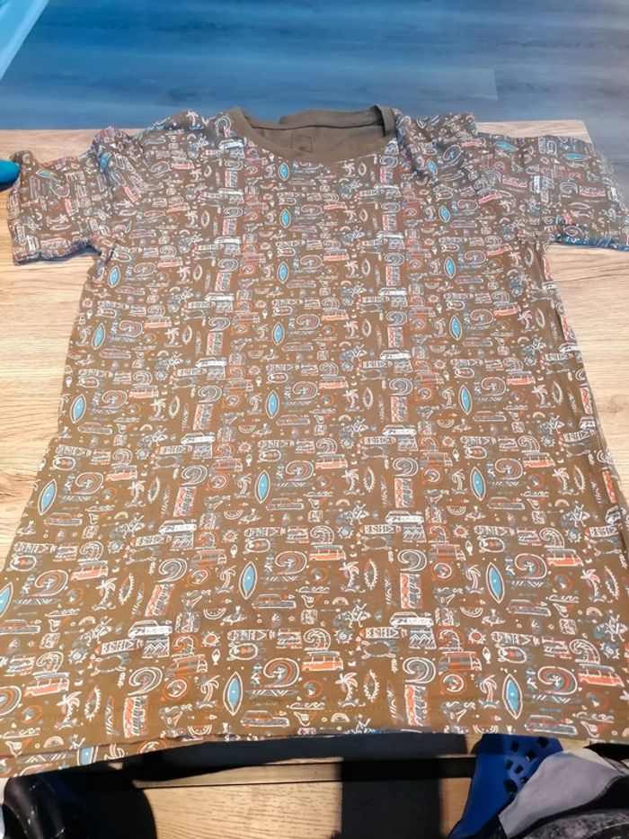 Bonjour, je vends ce tee shirt à manches courtes marron avec motifs blancs, oranges et bleus de la marque Firefly taille 16ans en très bon état. Lavé maison non fumeur.