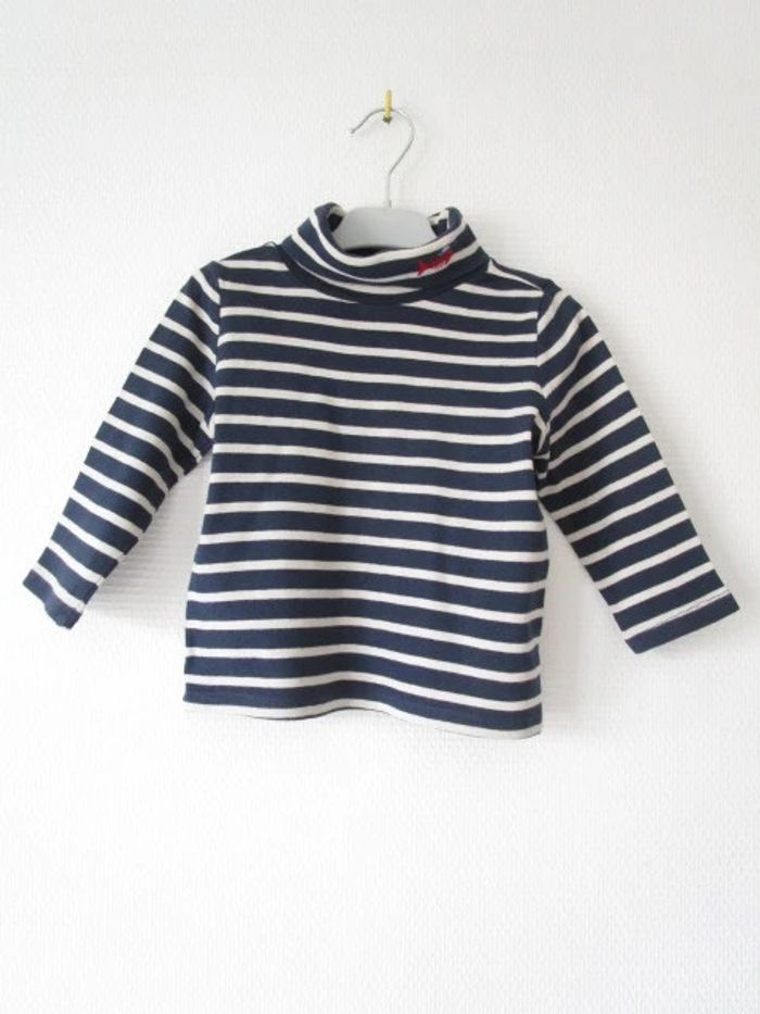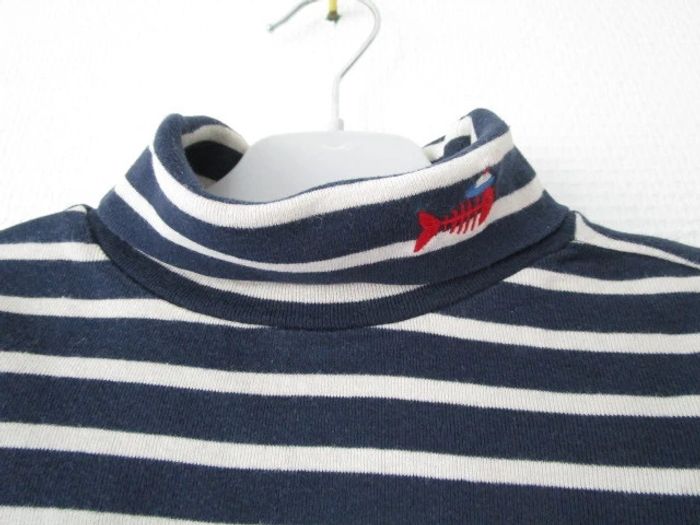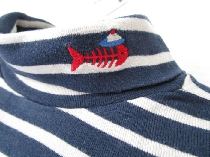 Sous-pull bleu marine rayé beige de marque Du Pareil Au Même taille 3 ans Style marinière Broderie petit poisson avec bonnet marin à gauche du col roulé 100% coton En très bon état #mamanbrade59garçon3ans