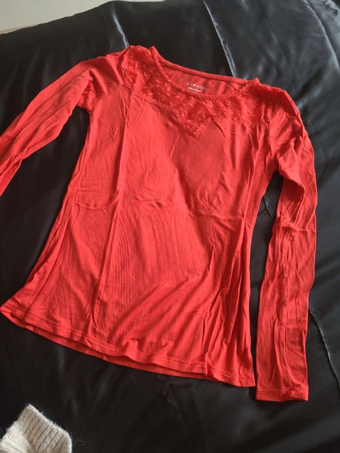 Tee-shirt manches longues rouge Détail dentelle au col Porté une seule fois