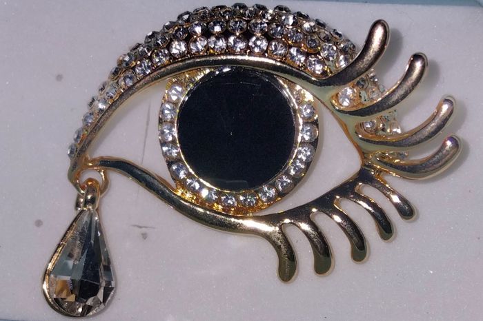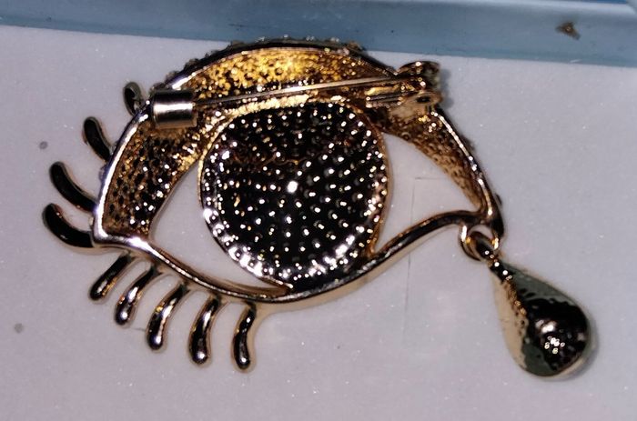 Broche fantaisie en métal de couleur doré Œil de couleur noir Paupière et contour de l œil en strass Cils de couleur doré Goutte sous l œil en pierre blanche Diamètre : 5x4 cm