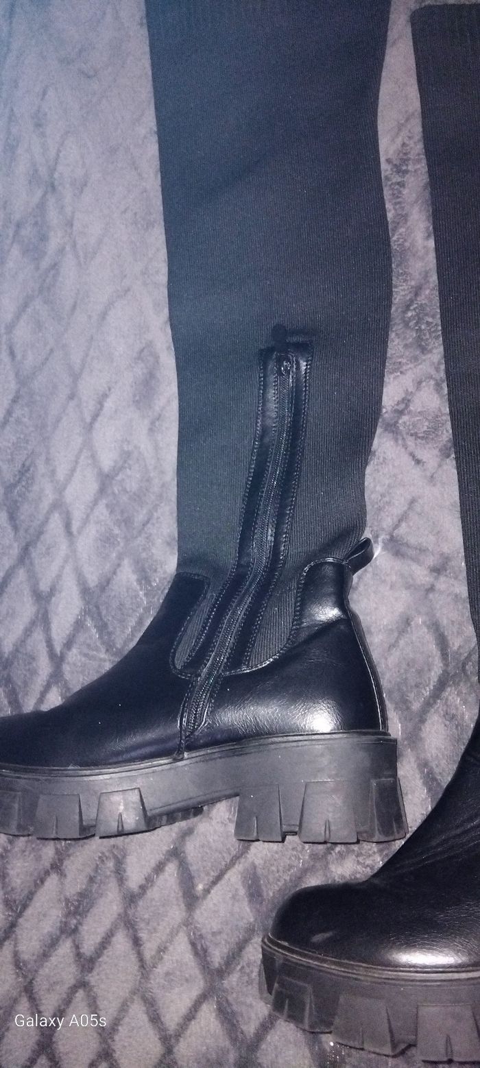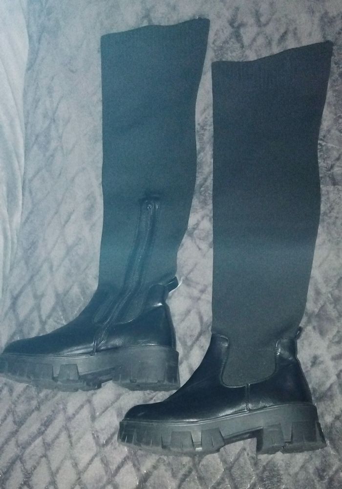 Paire de botte cuissarde de couleur noir Renforcer sur le devant Simili cuir et en tissu de couleur noir Une fermeture éclair sur la demi cuissarde Hauteur total posée à plat : 58,5 cm Longueur fermeture éclair : 25 cm Hauteur de la semelle : 5 cm