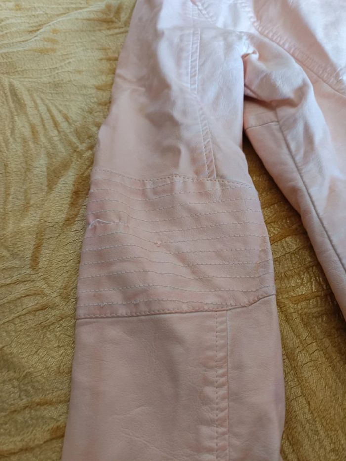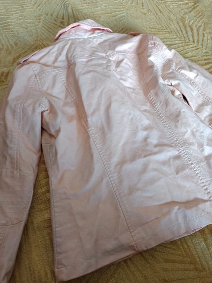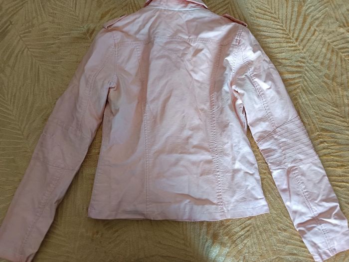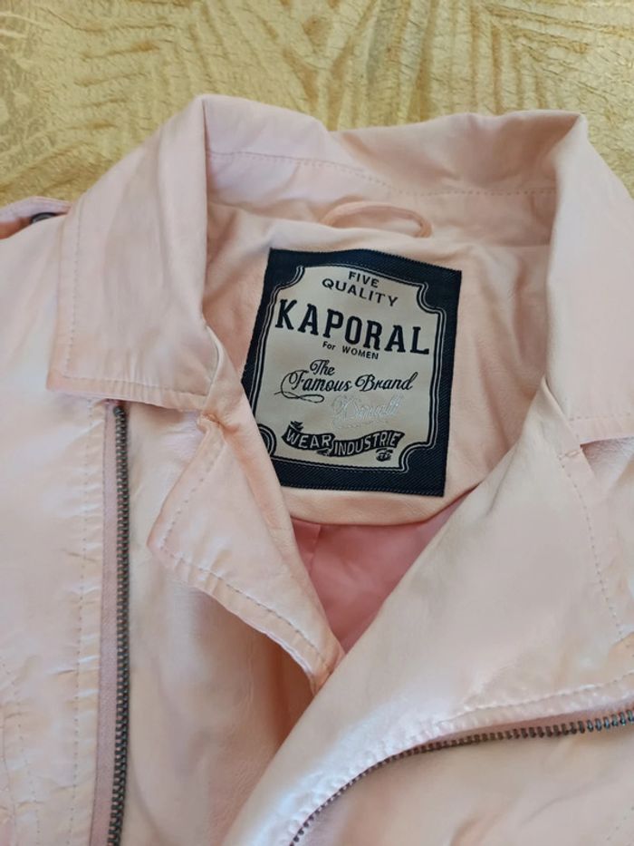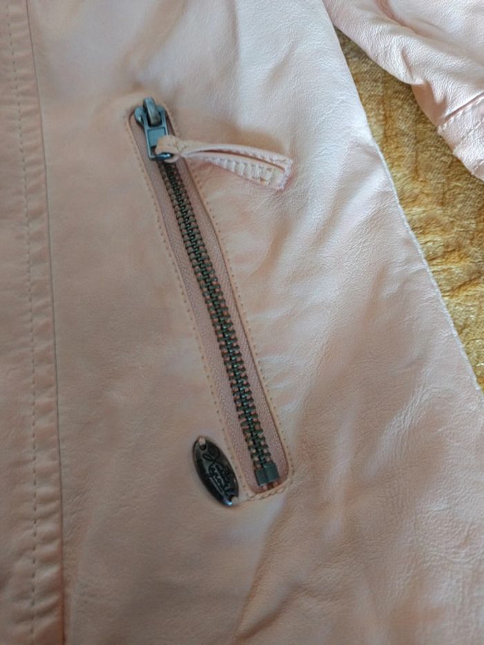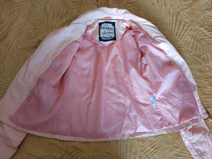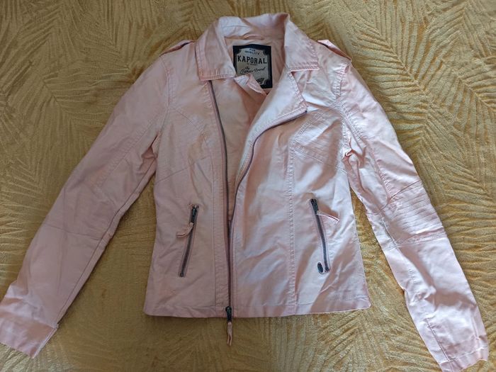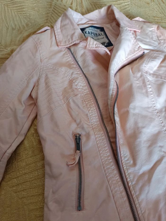 Veste simili cuir Kaporal taille S, couleur rose saumon Très bon état juste un petit défaut sur une manche (voir dernière photo)