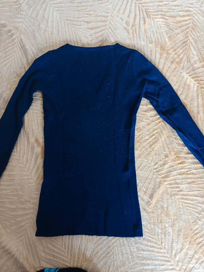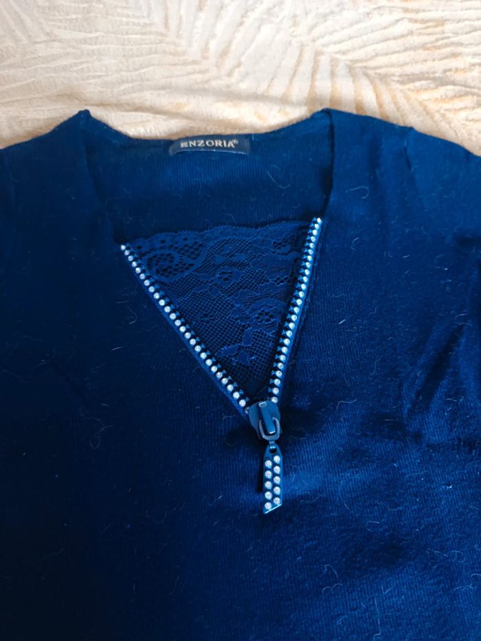 Pull bleu marine, fermeture à strass et décolleté dentelle, taille S Très bon état juste des poils