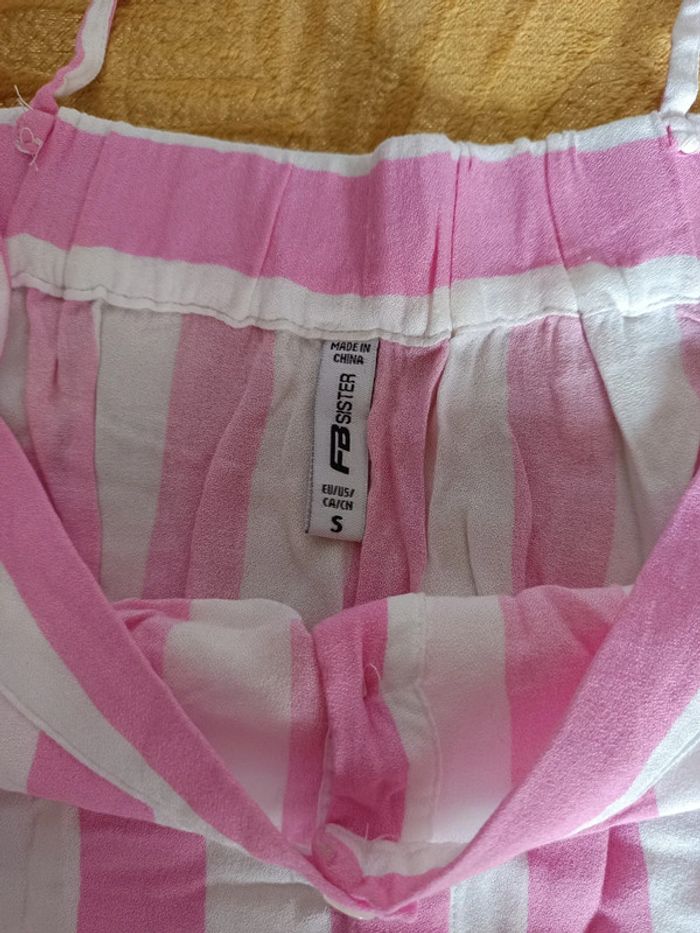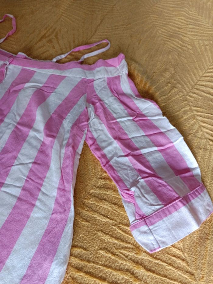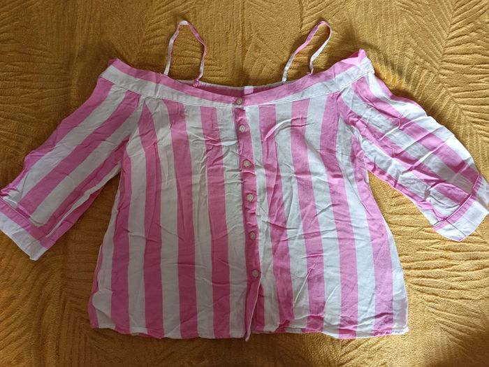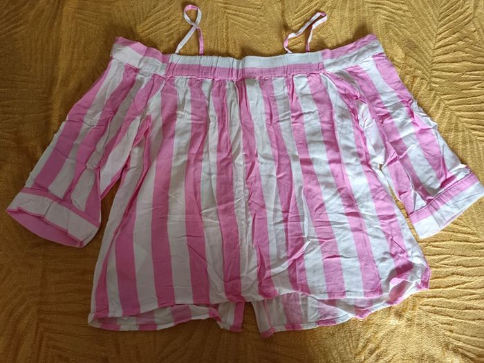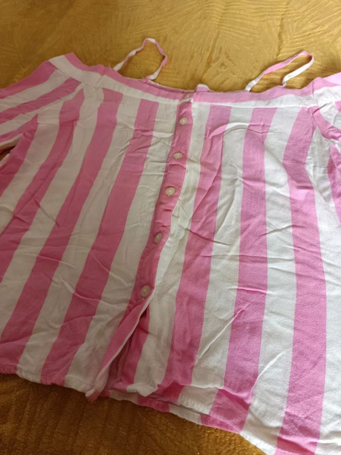 Top chemisier épaule dénudées rose et blanc, taille S. Très bon état, juste froissé
