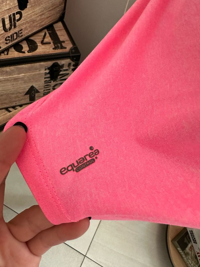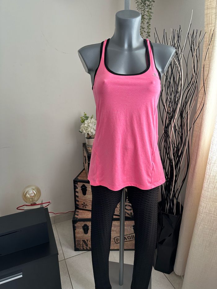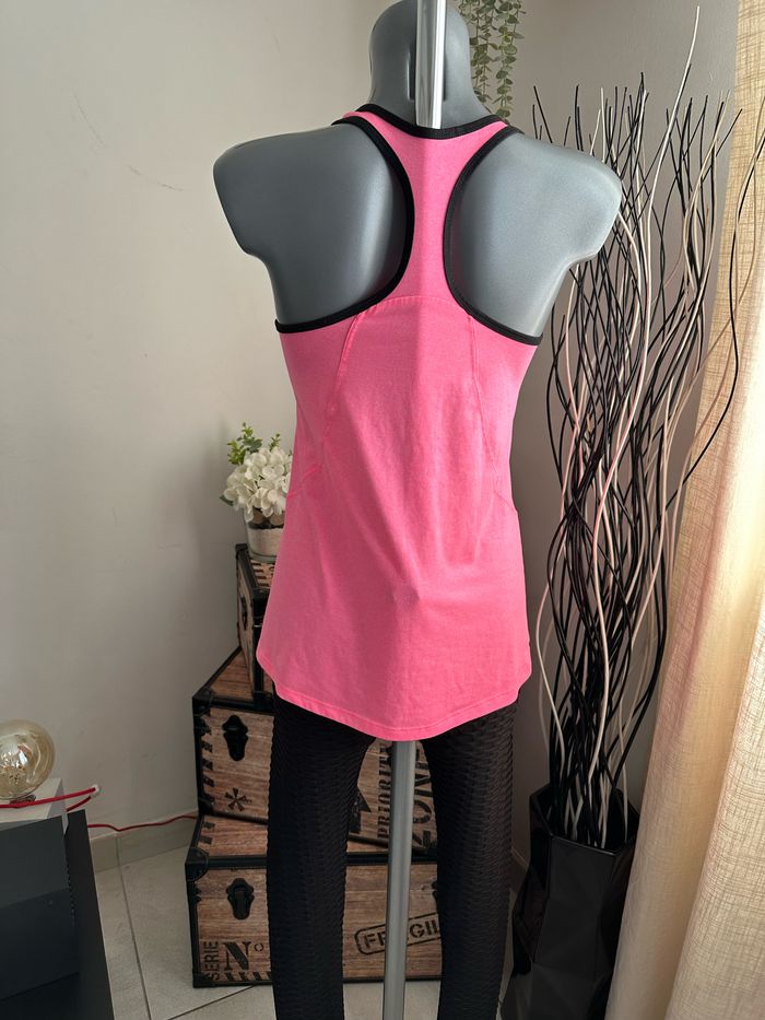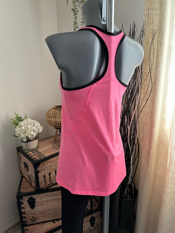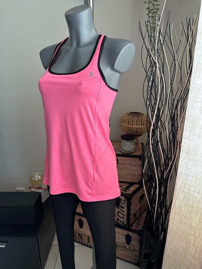 Débardeur rose fluo et bordure noire , matière extensible Taille M. Domyos. Seconde main en très bon état