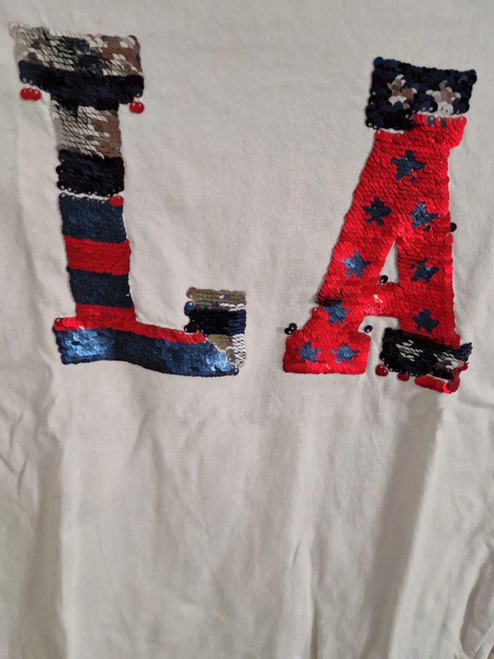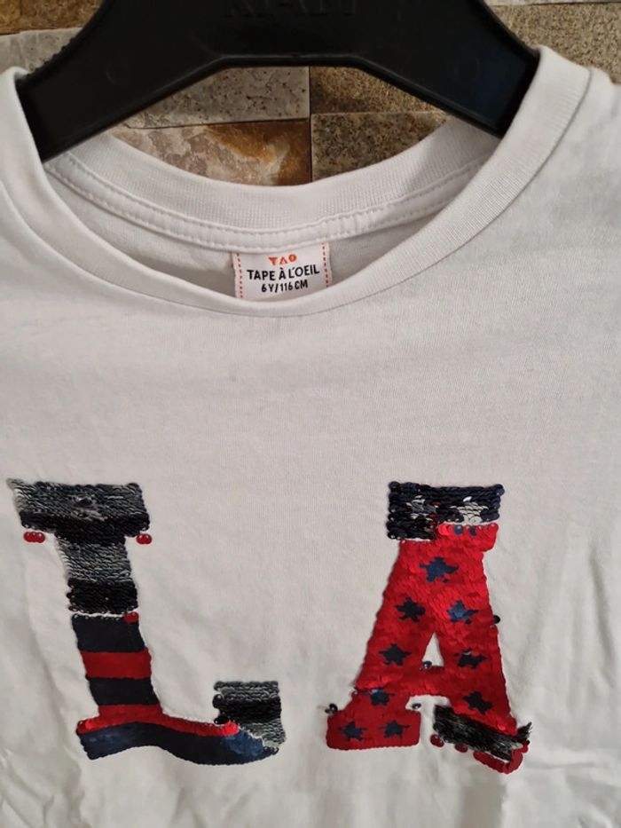 T shirts sequins 6 ans taille grand Tache crayon bleu entre le L et A (photo)