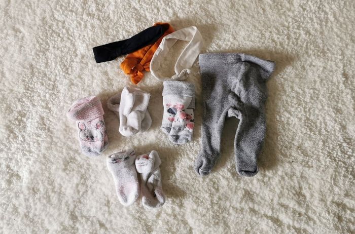 Petit lot avec un collant, des chaussettes et des petits bandeaux