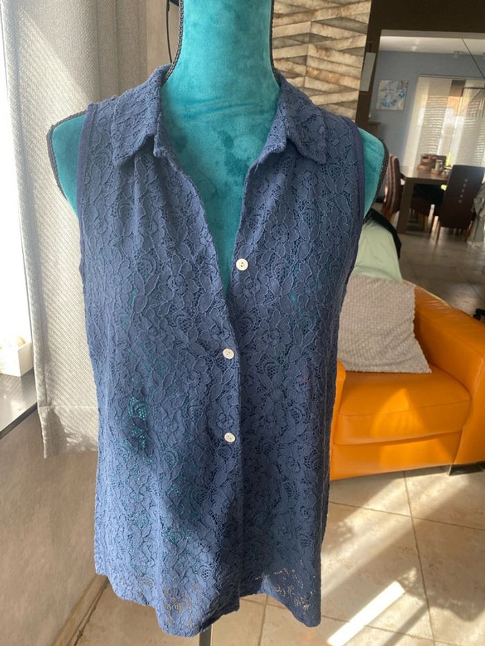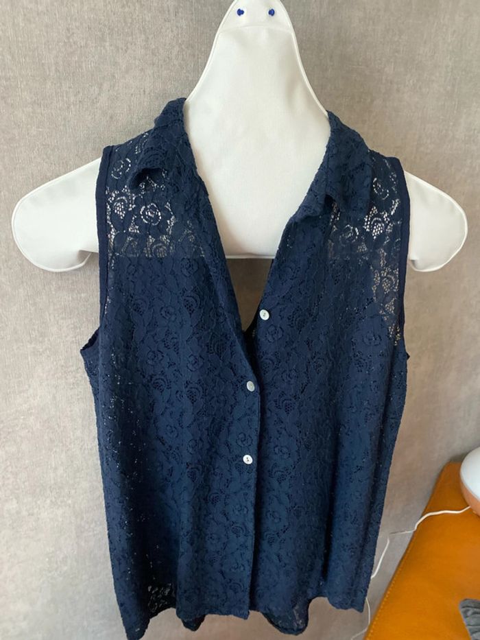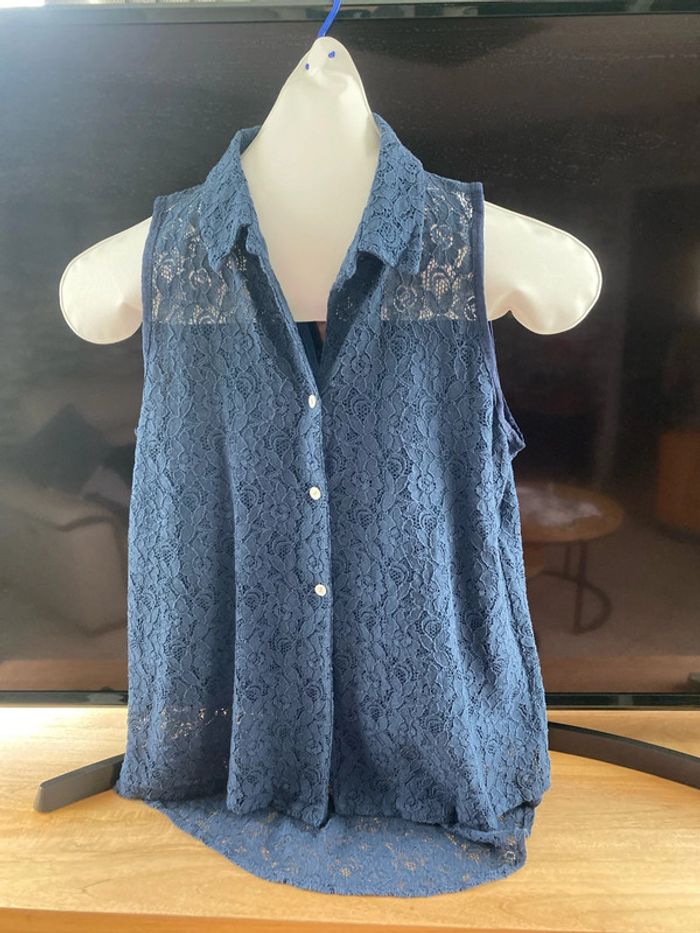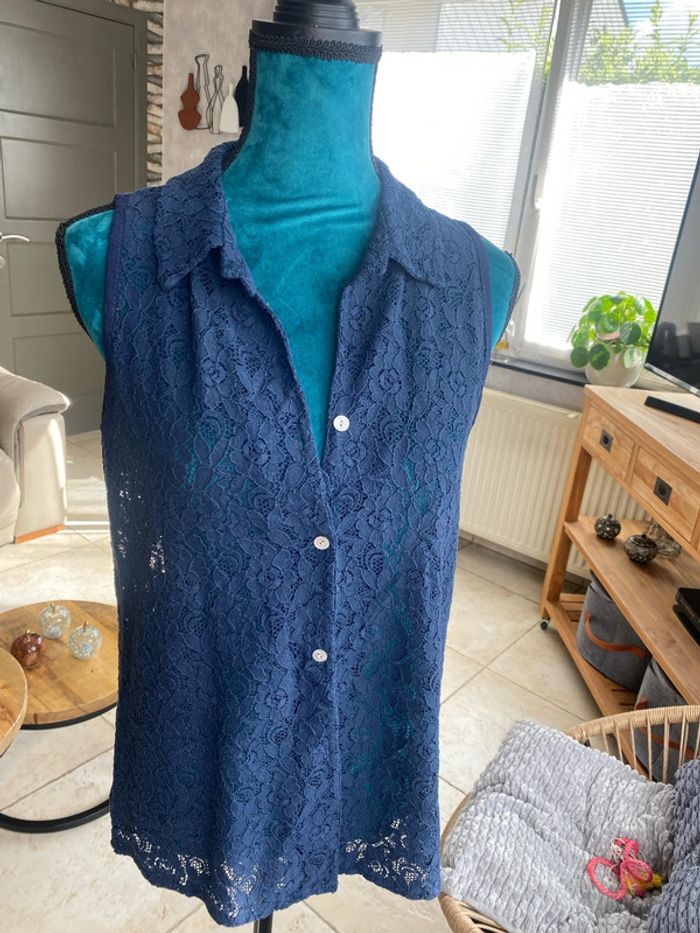 Très beau chemisier en dentelle bleu marine Jolie découpe à l’arrière Un peu plus long à l’arrière État impeccable Étiquette taille manquante je dirais un 40/42 N’hésitez pas à demander les mesures
