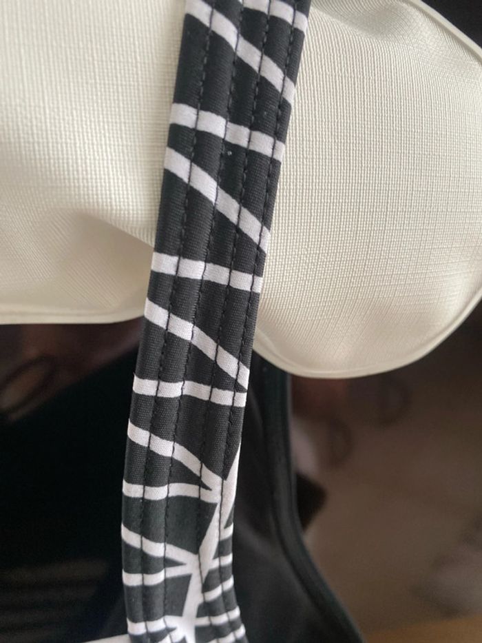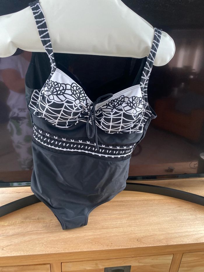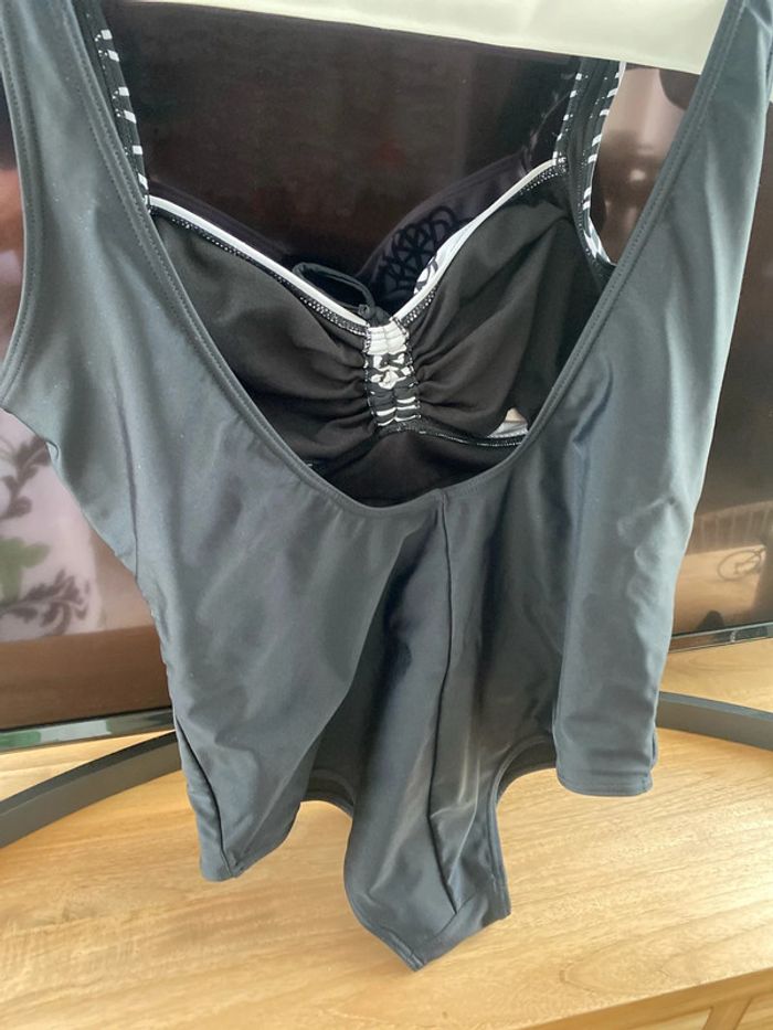 Maillot noir et blanc Coques amovibles au niveau de la poitrine Les motifs blancs au niveau de la taille sont sur de la résille, c’est donc en transparence mais très légèrement ( voir quatrième photo) Peu porté excellent état Taille FR 42/44 Taille EU 44/46