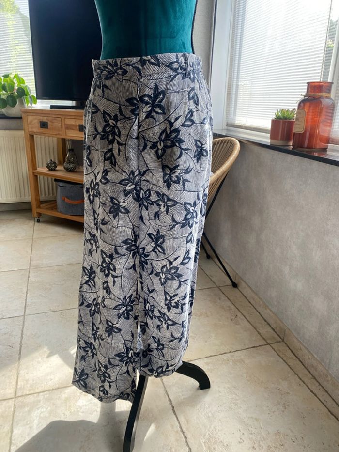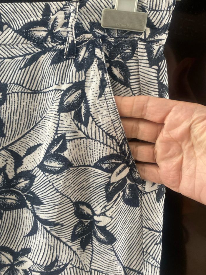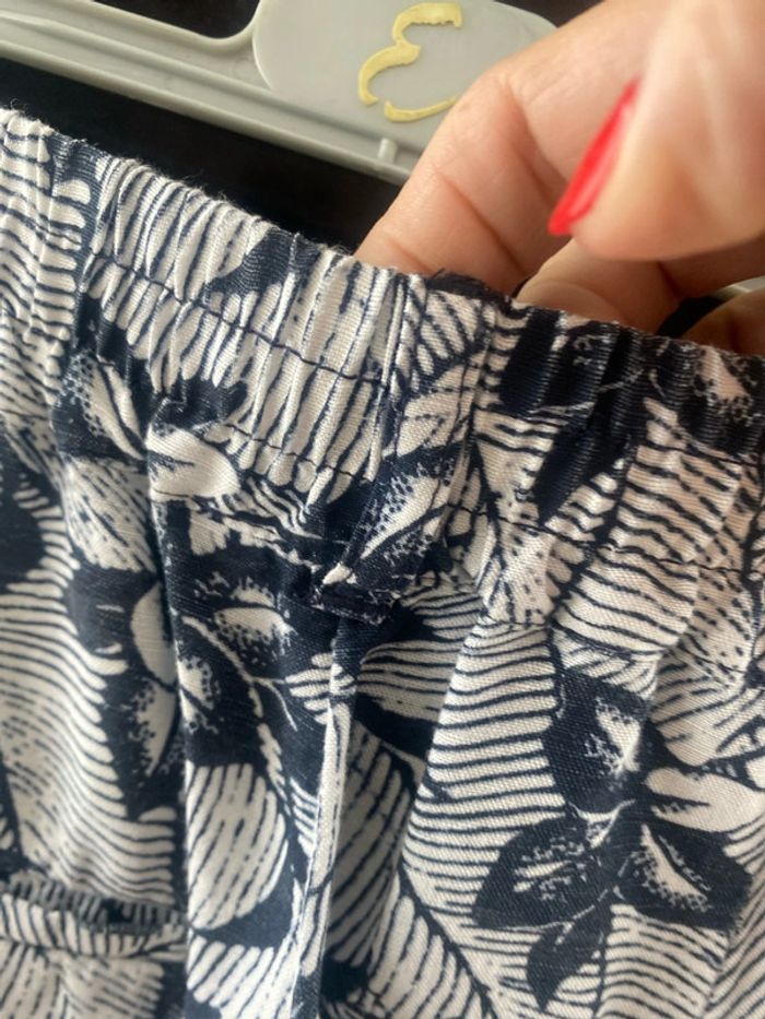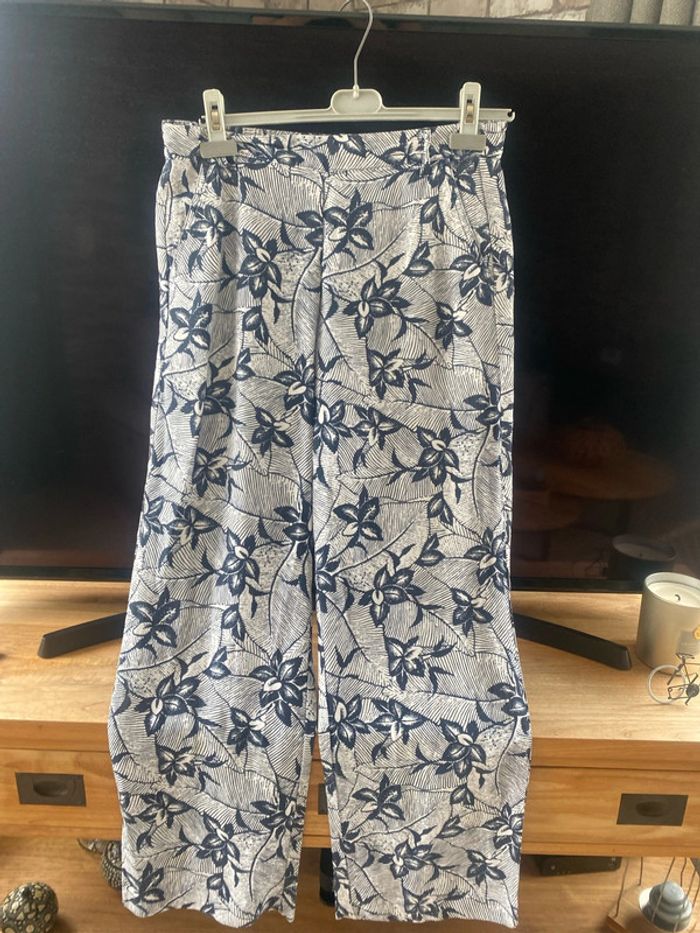 Pantalon en lin et viscose Blanc et marine 2 poches latérales, taille élastique à l’arrière et passants pour ceinture Porté quelques fois, état impeccable Attention taille Fr 40 Eu 38