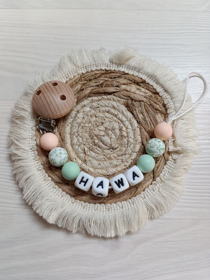 Attache tétine personnalisée Bois naturel et silicone alimentaire Sans BPA ni autres substances toxiques Différents coloris