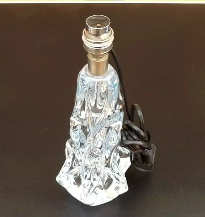 Années 1950 Pied de lampe (grand modèle) Verre transparent Douille à baïonnette Hauteur (avec douille) : 310mm Câble électrique avec interrupteur : 2m30 Poids : 2kg460