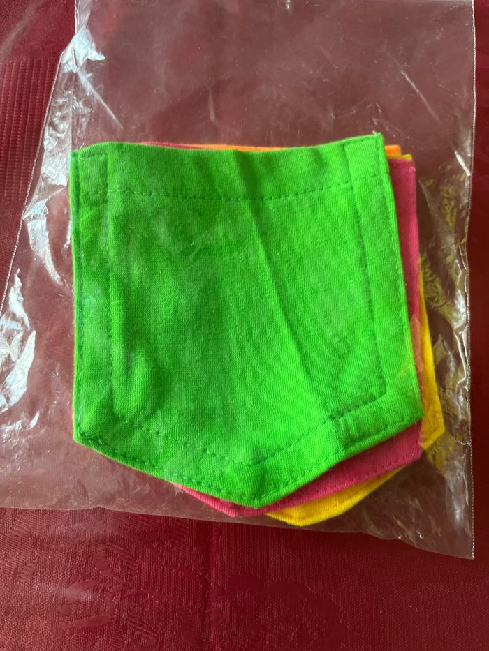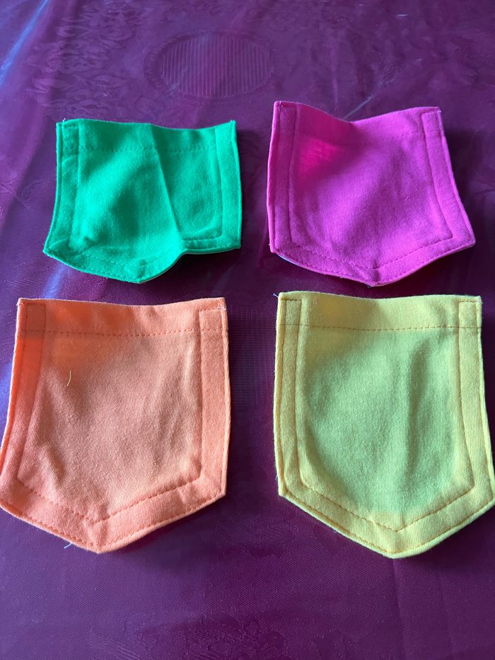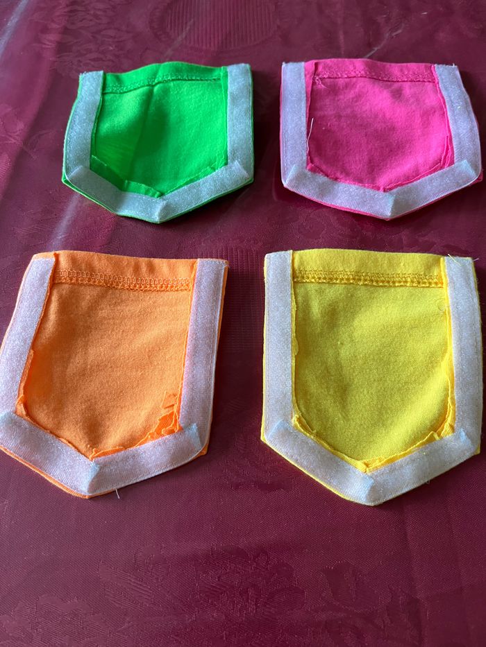 Lot de 4 sets de poches amovibles à velcros idéale pour agrémenter vos tenues articles de mercerie il y as 1rose 1 vert 1 orange et 1 jaune les couleurs sont fluo 100% coton les velcros sont déjà posé il suffit de les mettre sur votre vêtement choisi acheter en mercerie 12,90 les 4 céder 5 € les 4 neuf jamais servi