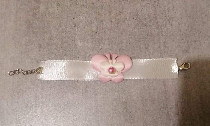 Bracelet fait main en tissu avec un papillon rose et un autre blanc orné d'une perle dans les tons rose. Celui-ci convient à un poignet allant de 13,5 à 15,5cm mais il peut être fait à toutes les tailles. Idéal pour une fête