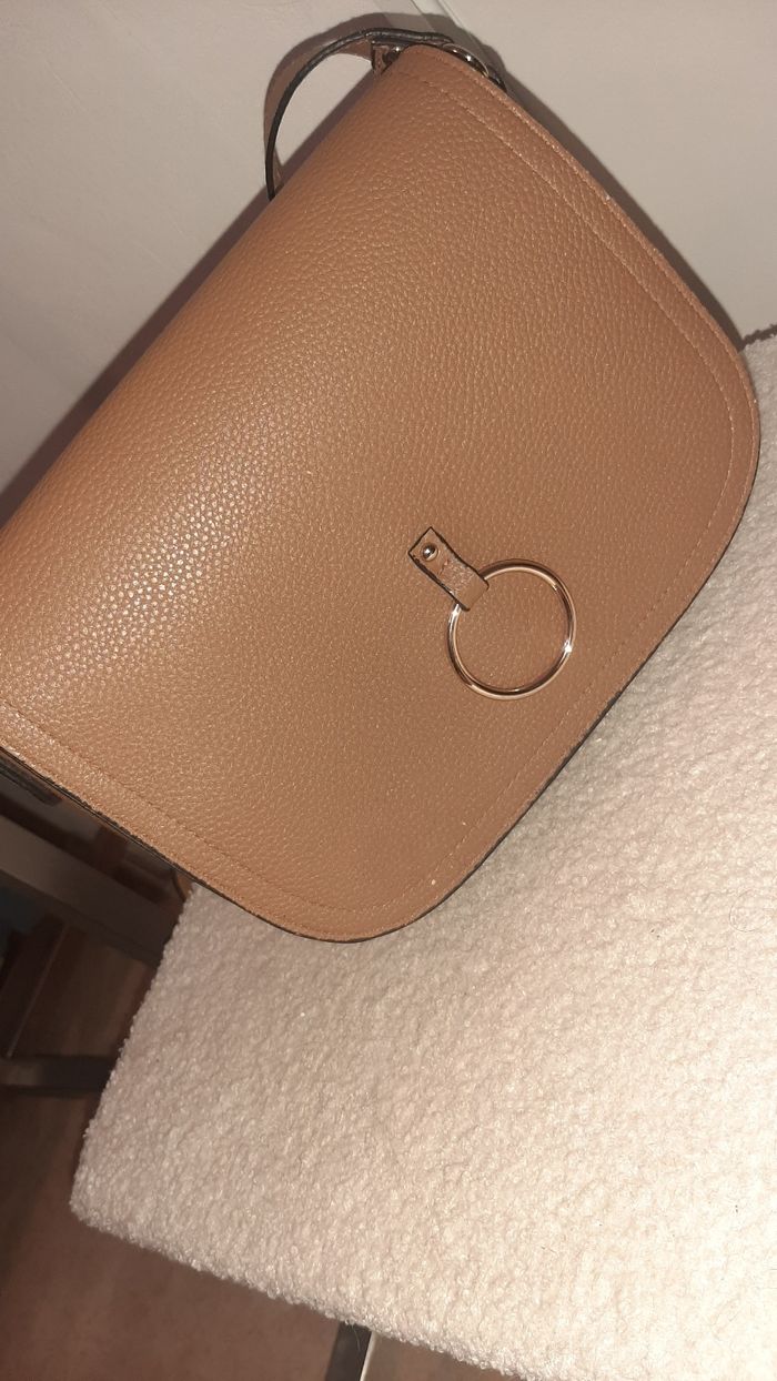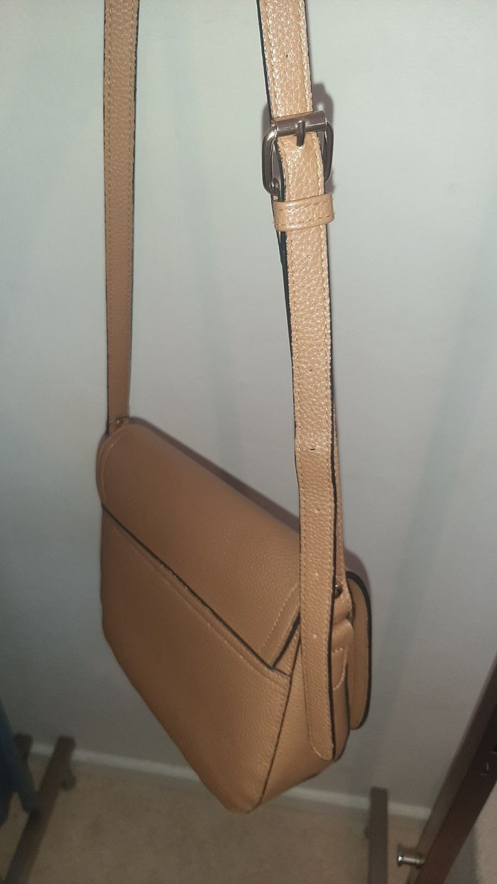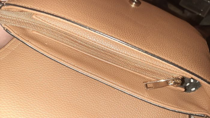 Similicuir, deux petites points (défaut) sur le devant. Doublure avec pochette à zip. Plus sécurité avec un fermeture et aimant. La bandoulière se règle.