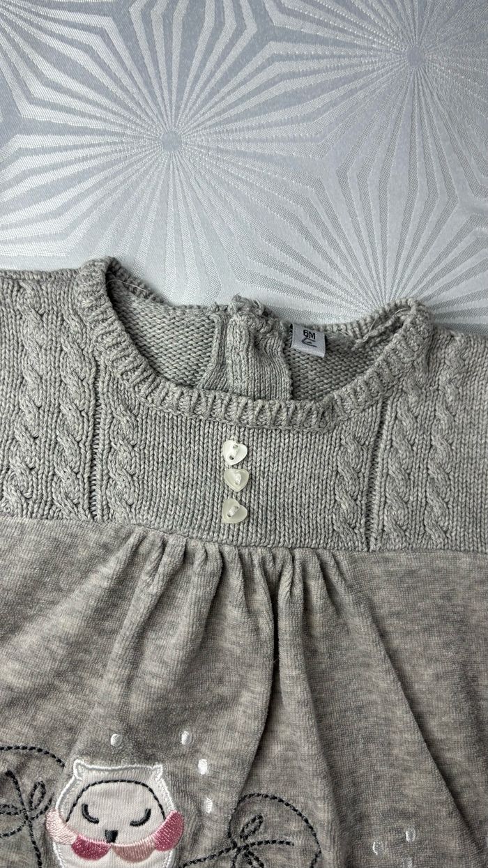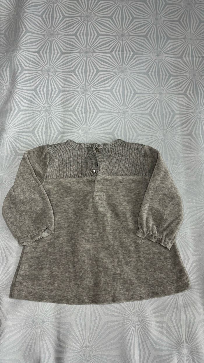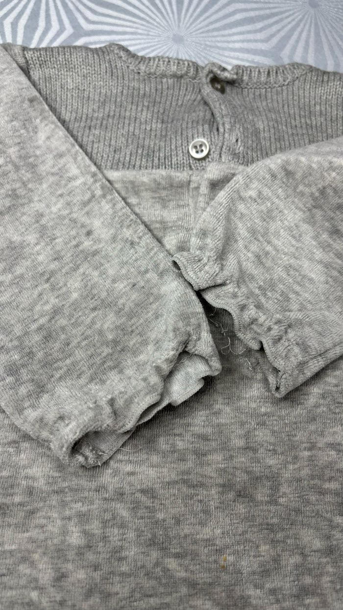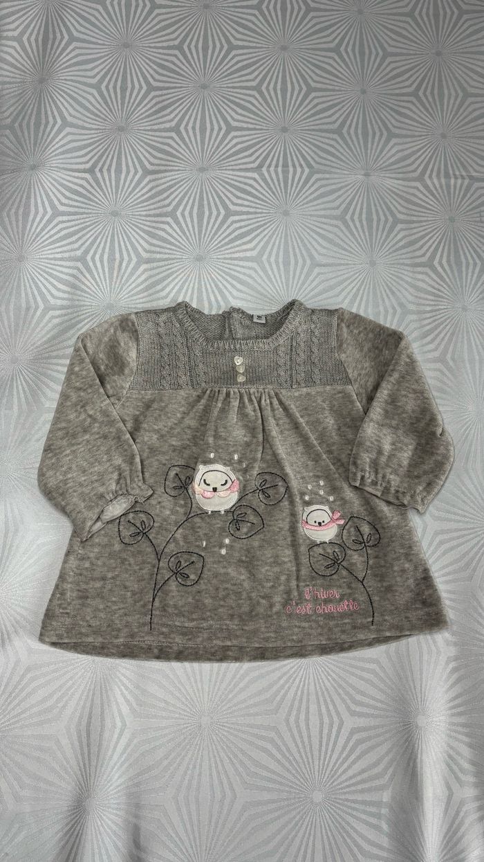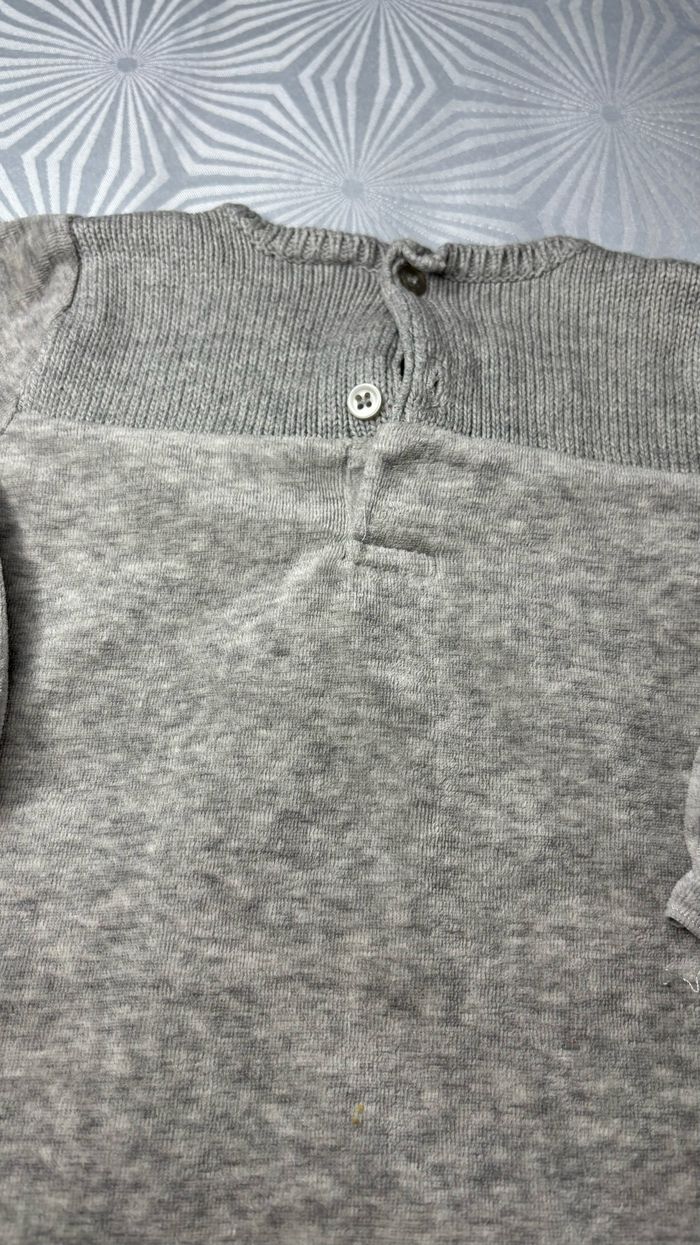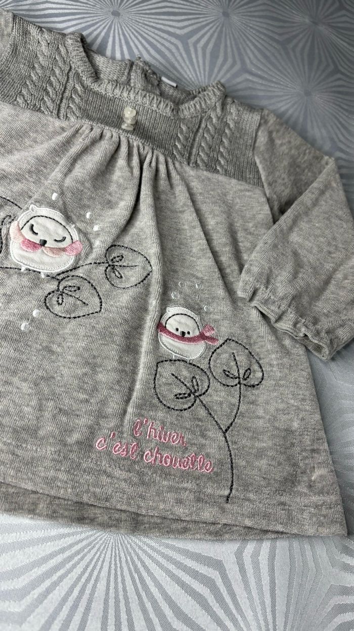 🧶 Pull velours 🧶 🦉 Taille: 6 mois 🦉 Couleurs: Gris en laine sur le haut et en velours sur le bas 🦉 Broderies chouettes et feuilles avec écriture « l’hivers c’est chouette » ‼️ Les élastiques aux bouts des manches sont un peu distendus mais ne dérange en rien