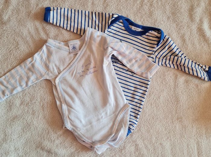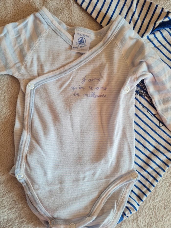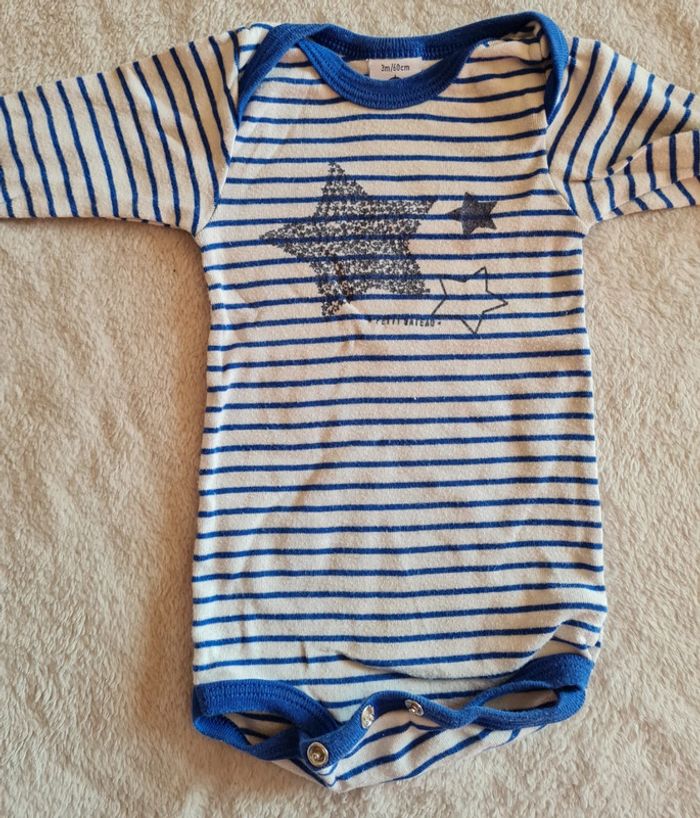 Portés plusieurs fois, 3 mois , bleu clair à rayures, et l autre bleu foncé avec motif étoiles et rayures Manches longues #bodiesbebegarcon #bodiesbebe #bodiespetitbateau #blandine20092020_taille3mois