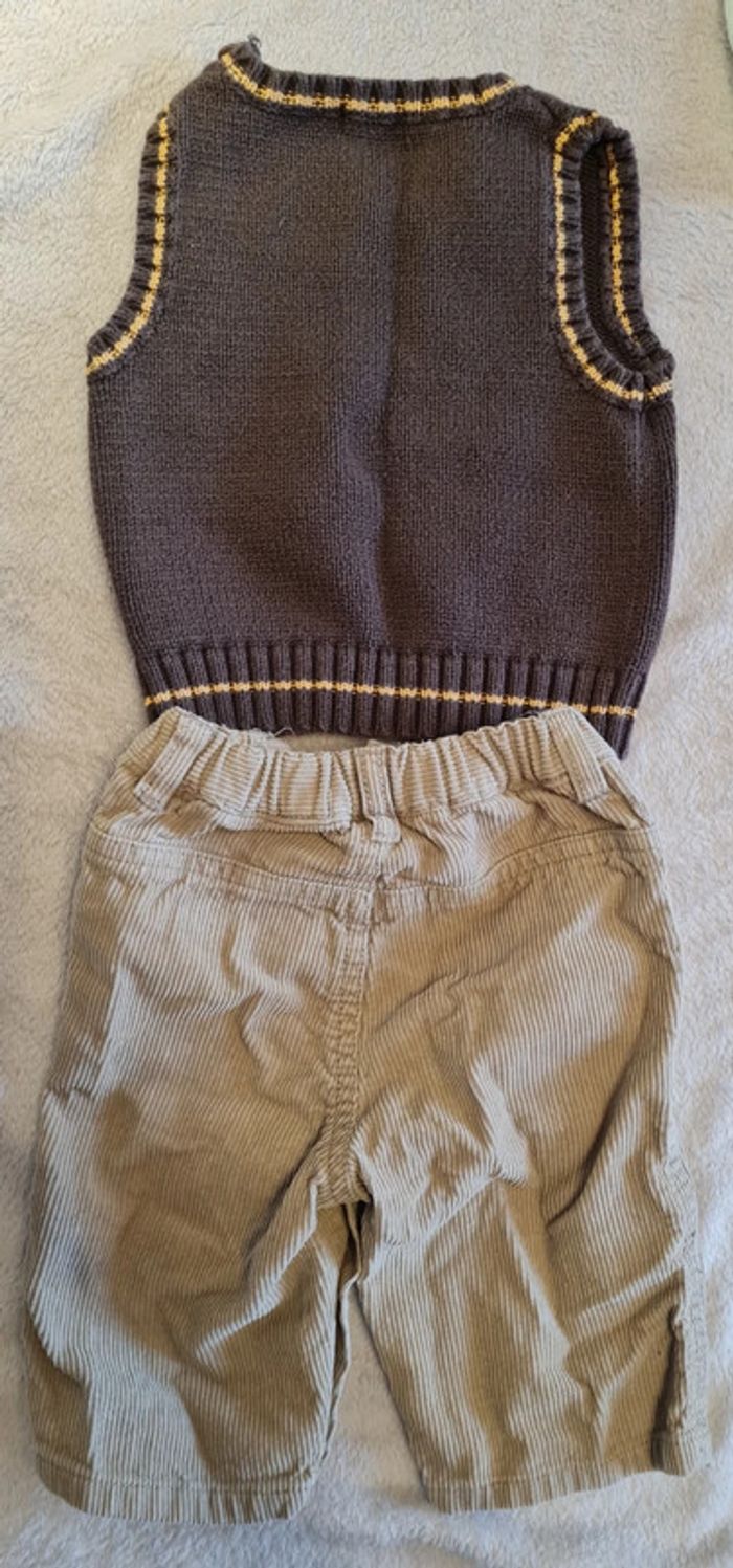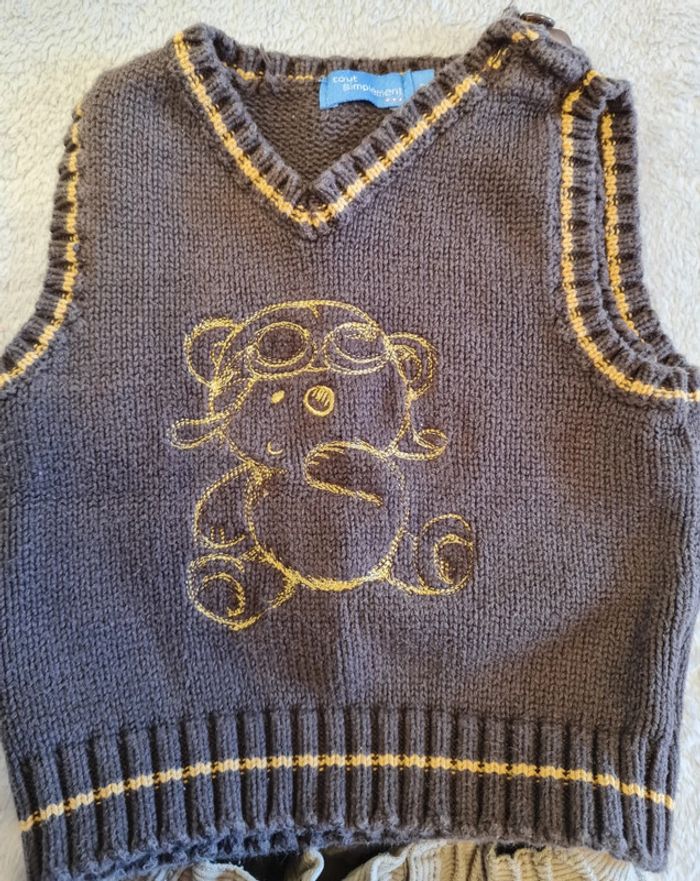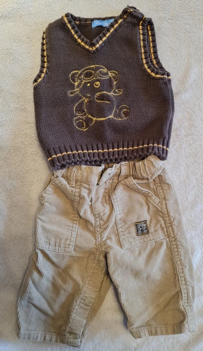 Porté quelques fois. Pantalon 100 % coton marron clair élastique avec son pull sans manches marron foncé avec imprimé ourson . Taille 3 mois #ensemblebebegarcon #ensemblebebe #blandine20092020_taille3mois