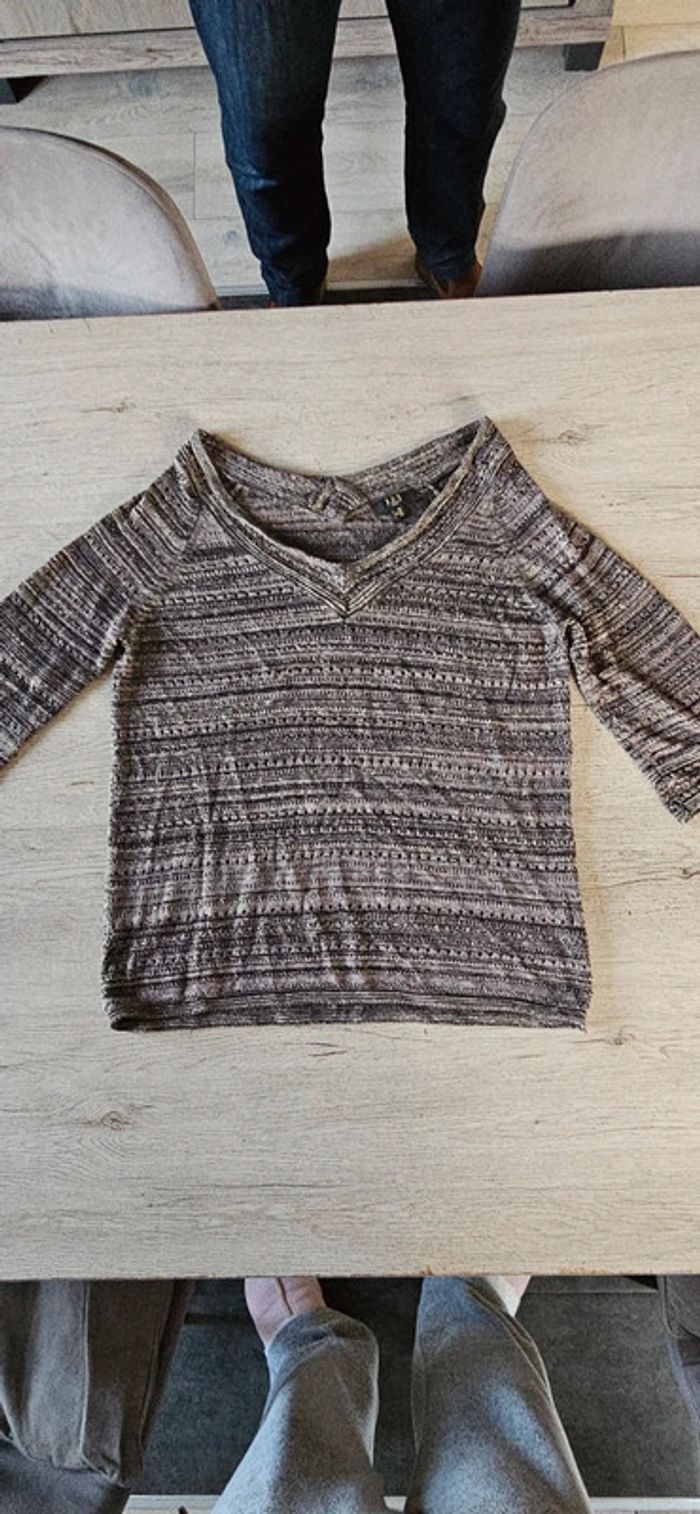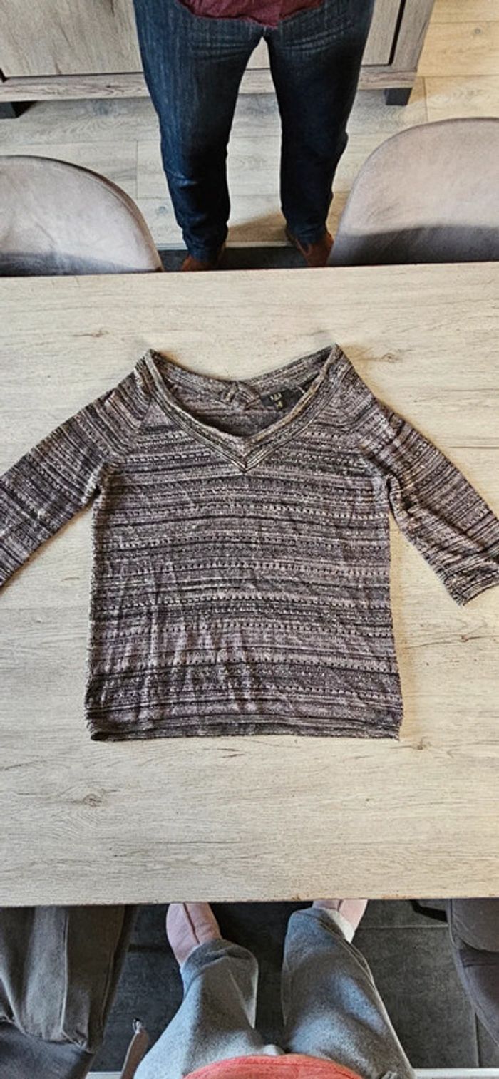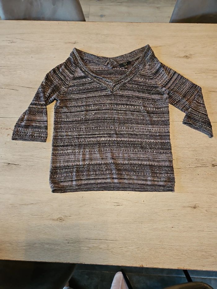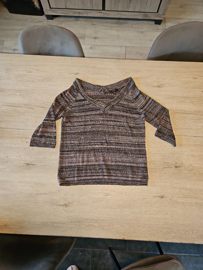 Jolie blouse à col en V large. Couleur três originale, brun avec du beige et des fils dorés. En excellent état car trop petit pour moi #deborahtock_femmeM