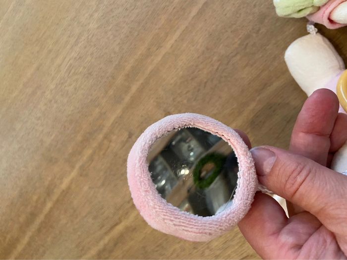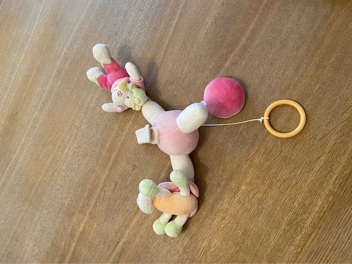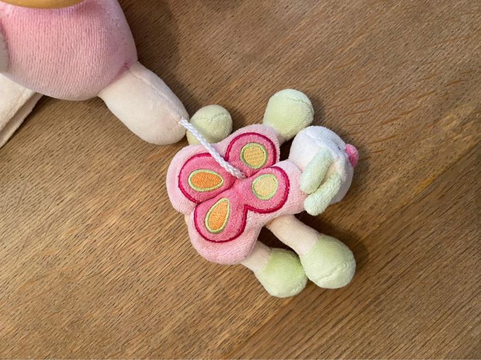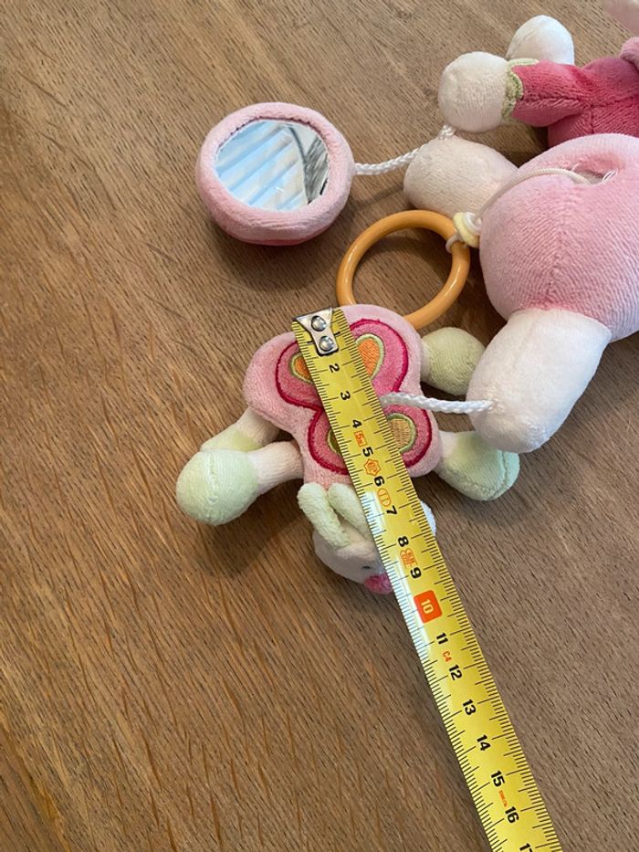 Petit mobile à attache scratch constitué de trois éléments (miroir boule, papillon, personnage). Facile à attacher sur une poignée de cosi, dans la voiture, landeau ou tout autre support. En très bon état. J’ai malheureusement oublié la marque.