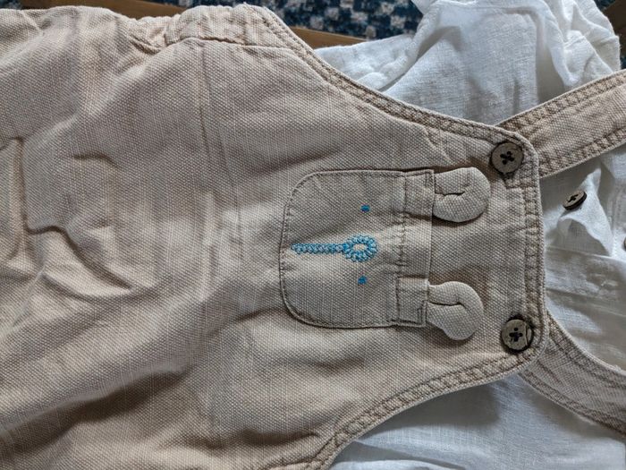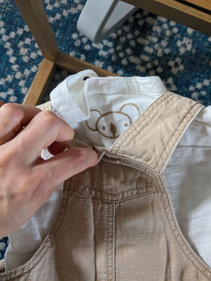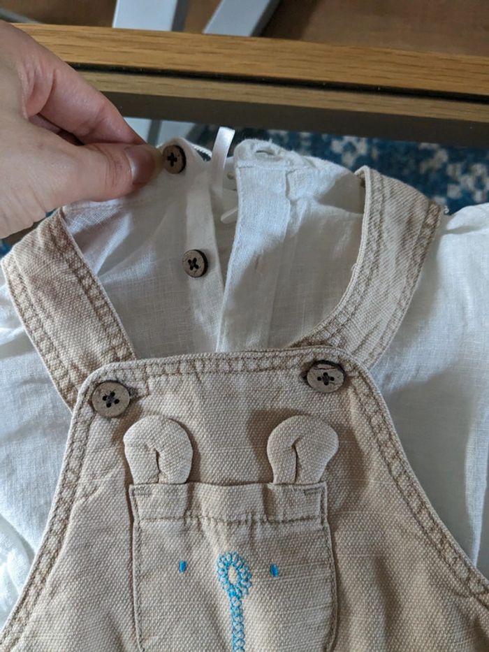 Ensemble salopette Avec une chemise en lin col mao blanche Une salopette beige avec ourson Neuf Taille 3 mois