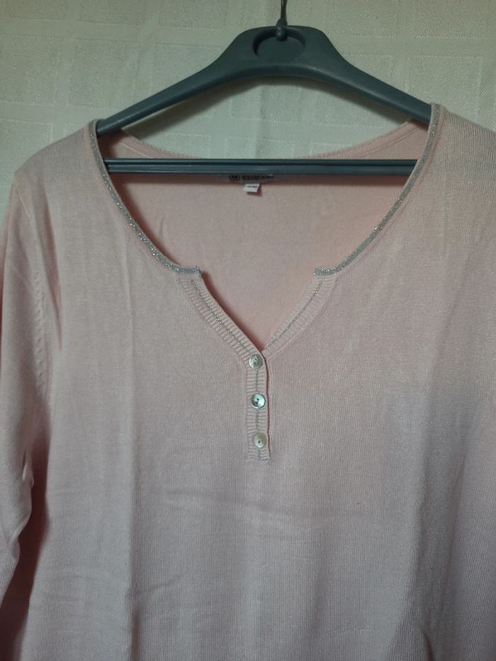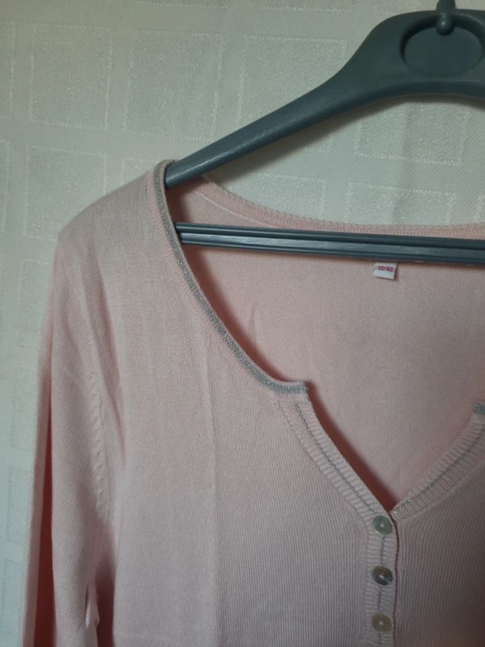 ⬇️mes autres annonces pour femme en taille 40 👉 #cg89femme40 😁 réductions activées des 2 articles ! Un pull rose avec un beau décolté en "V" avec un liséré argenté qui lui donne un look magnifique. Il mesure 40 cm aux épaules, 47 cm aux aisselles et 68 cm de longueur Très bon état, taille 40 #taille40 #pull #argenté #colv