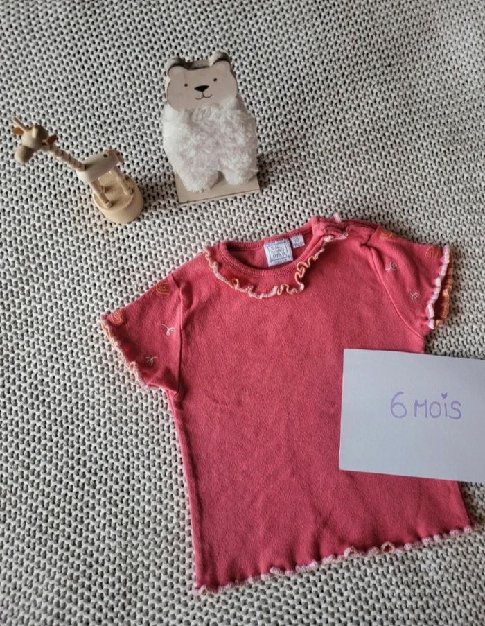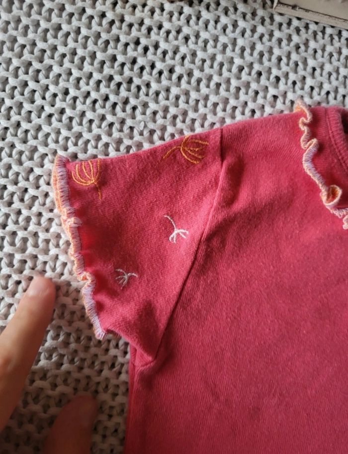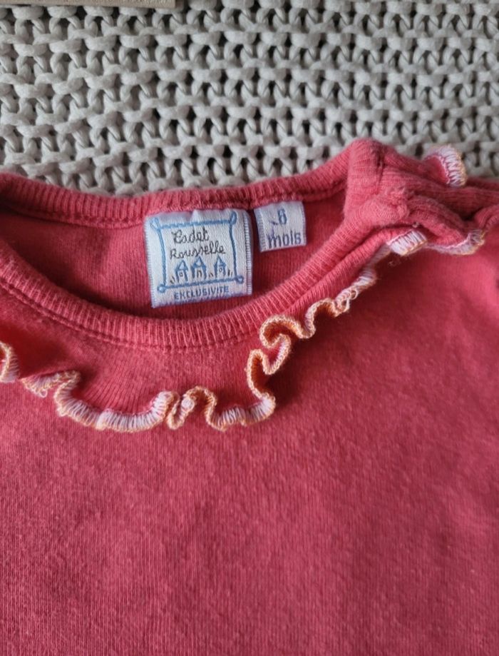 💥 T-shirt à manches courtes de la marque CADET ROUSSELLE. 👉 Taille 6M 👉 T-shirt en coton rose avec col en volants et des broderies blanches et oranges. 👉 MODÈLE VINTAGE ⚠️ Très peu porté (enfant handicapé ne se déplace pas et n'abîme pas) ÉTAT : Très bon état ❤️ ✅️ Réduction pour achat en lot 🫶