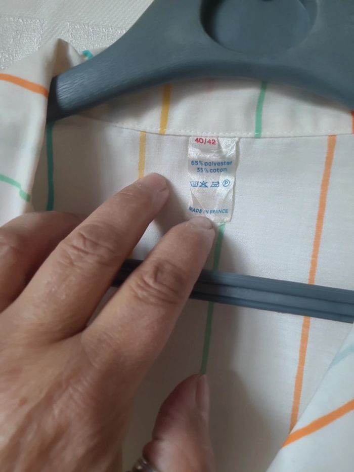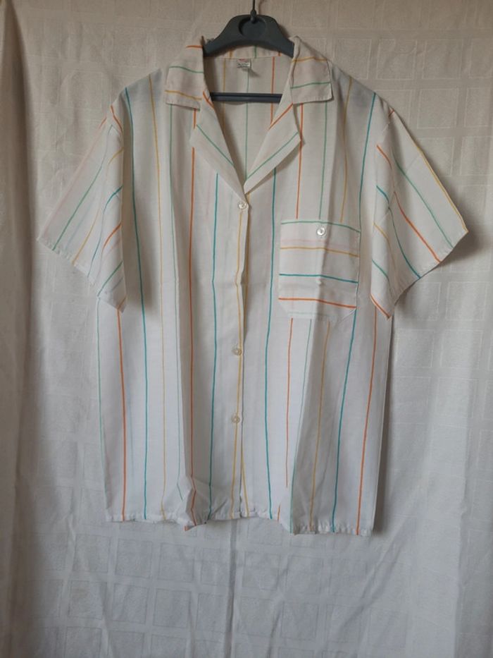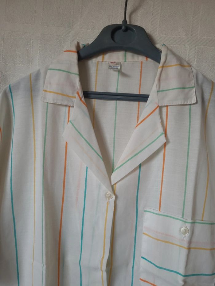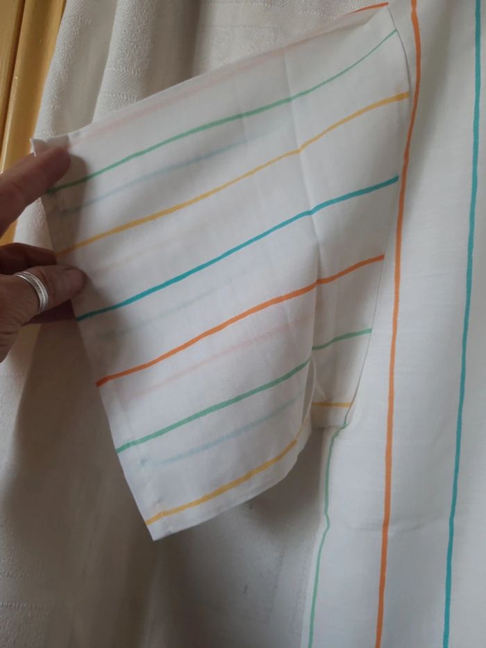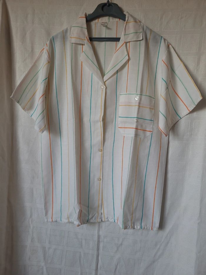 ⬇️mes autres annonces pour femme en taille 42 👉 #cg89femme42 😁 réductions activées des 2 articles ! une blouse vintage avec des rayures multicolores et poche sur la poitrine. Elle mesure 48 cm aux épaules, 54 cm aux aisselles et 68 cm de longueur Très bon état, taille 42 #blouse #chemise #manchecourte #rayure #taille 42 #vintage