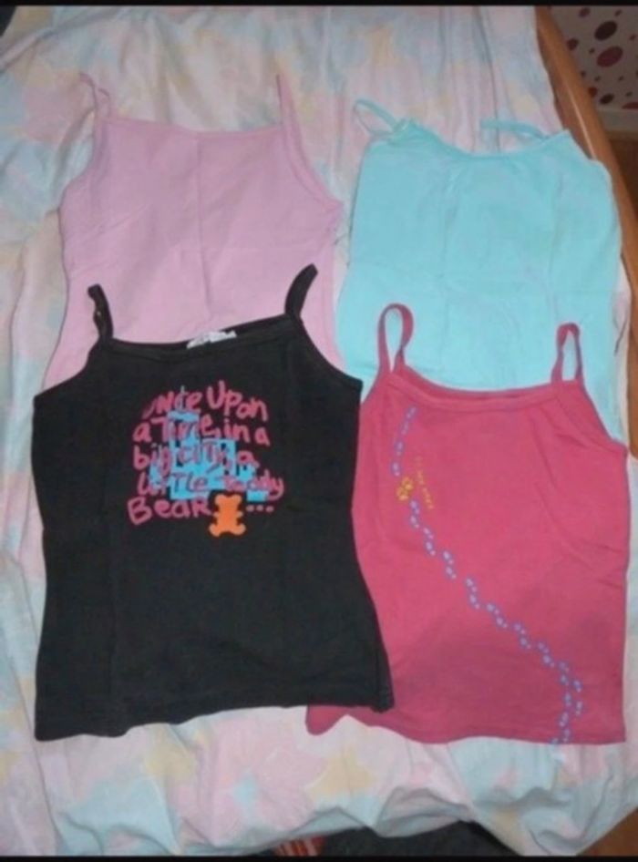 Débardeur rose clair: taille M Débardeur bleu Top Studio: taille 34/36 Débardeur noir cache cache taille 3 Débardeur rose Cache cache: taille 2