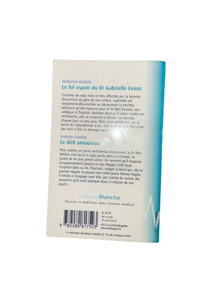 Bonjour. Fan des romans sur le thème hospitalier ? Un grand choix disponible dans mon dressing. #livremoisz 1 livre = 2 romans ✅ le fol espoir du Dr Gabrielle Evans. Meredith Webber. ✅ le défi amoureux. Marion Lennox. Livre en très bon état. Il n’y a que la couverture qui port la trace des lecteurs Une remise seras effectué pour l’achat de plusieurs de livre. 💁🏼‍♀️ Lire est un plaisir qui ne doit pas être freiné par le prix. Envoi rapide et soigné.